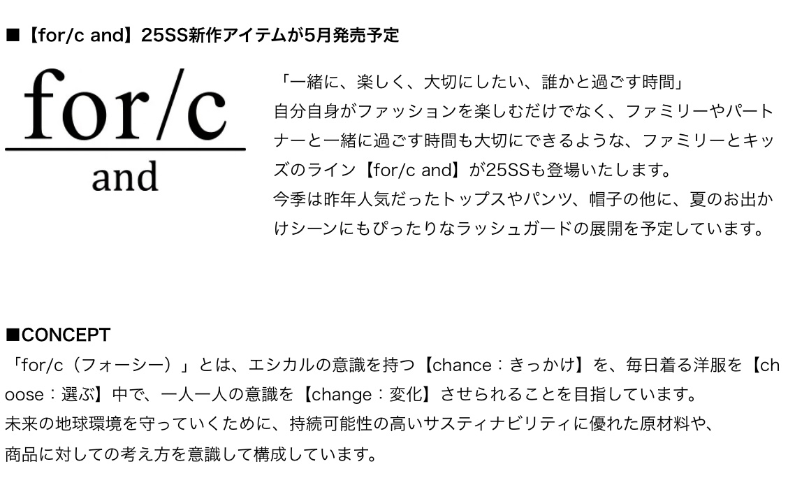 創業 70 年の老舗アパレルメーカー・クロスプラス株式会社(本社:愛知県名古屋市、代表取締役社 長:山本 大寛)が展開する、すべてにおいて人と環境にやさしい配慮をした洋服ブランド「for/c(フォーシー)」がブランド開始から3周年を迎えました。