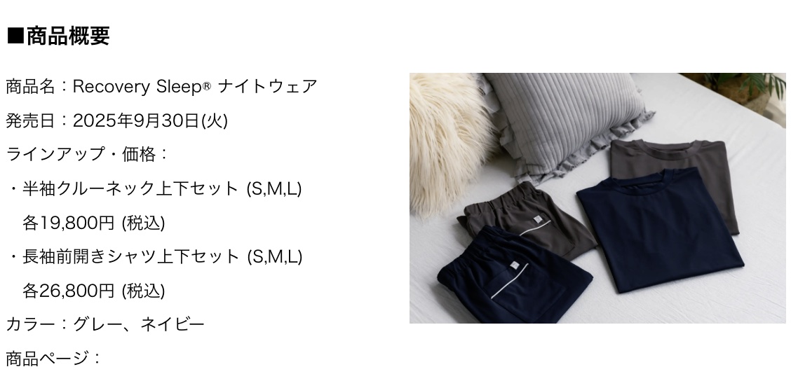 繊維専門商社モリリン株式会社(本社:東京都中央区、代表取締役社長:森 俊輔、以下モリリン)は、同社が展開する「Recovery Sleep®(リカバリースリープ)」ブランドより、一般医療機器の新商品、「Recovery Sleep® ナイトウェア」を2025年9月30日(火)に発売いたします。