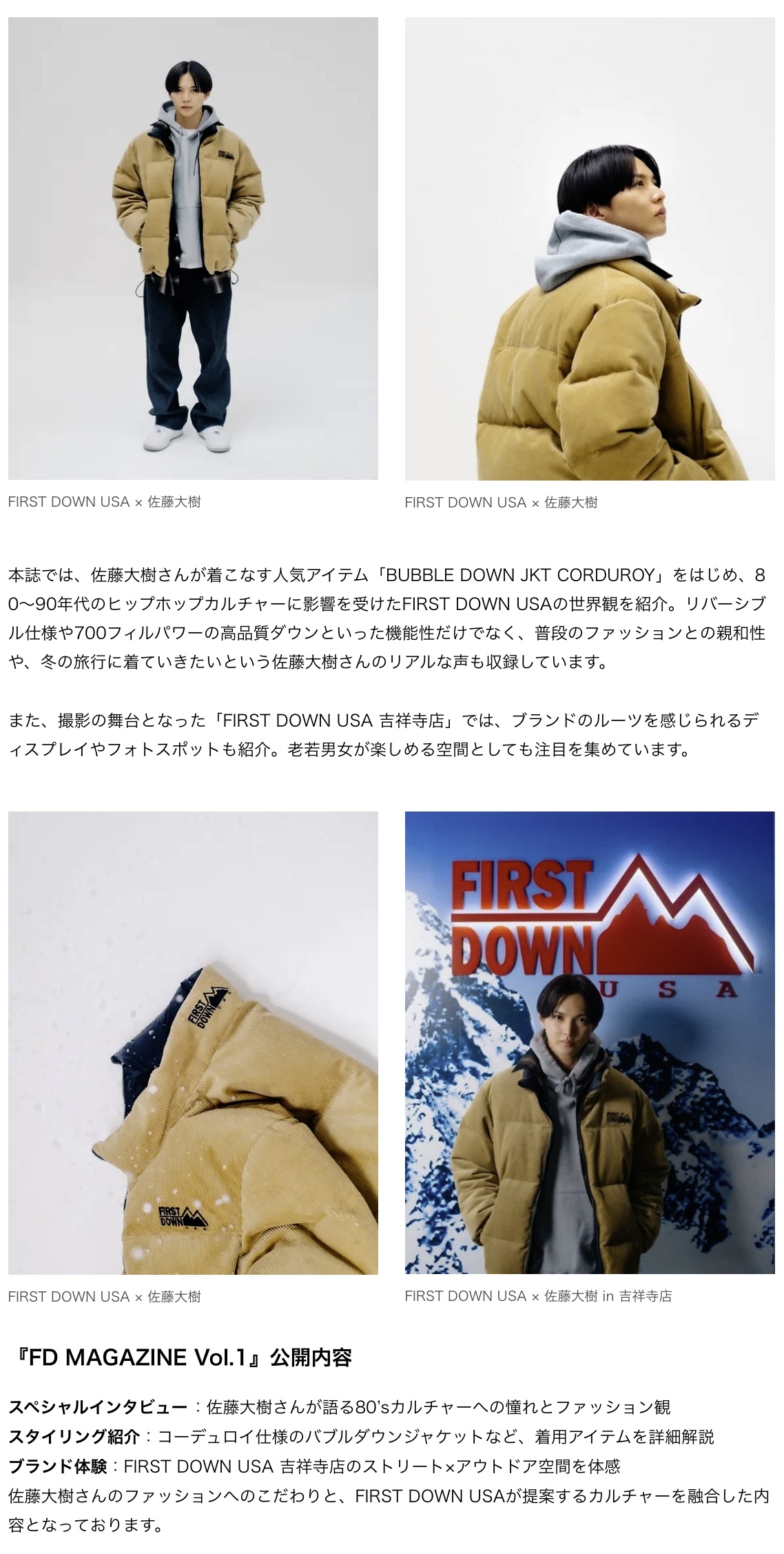 株式会社水甚 EXILE/FANTASTICS 佐藤大樹さん登場!FIRST DOWN USA公式WEBマガジン『FD MAGAZINE』創刊号を公開 1983年に誕生したダウンブランド「FIRST DOWN USA」が公式WEBマガジン『FD MAGAZINE』を創刊。Vol.1にはEXILE/FANTASTICSの佐藤大樹さんが登場します (2025.10)