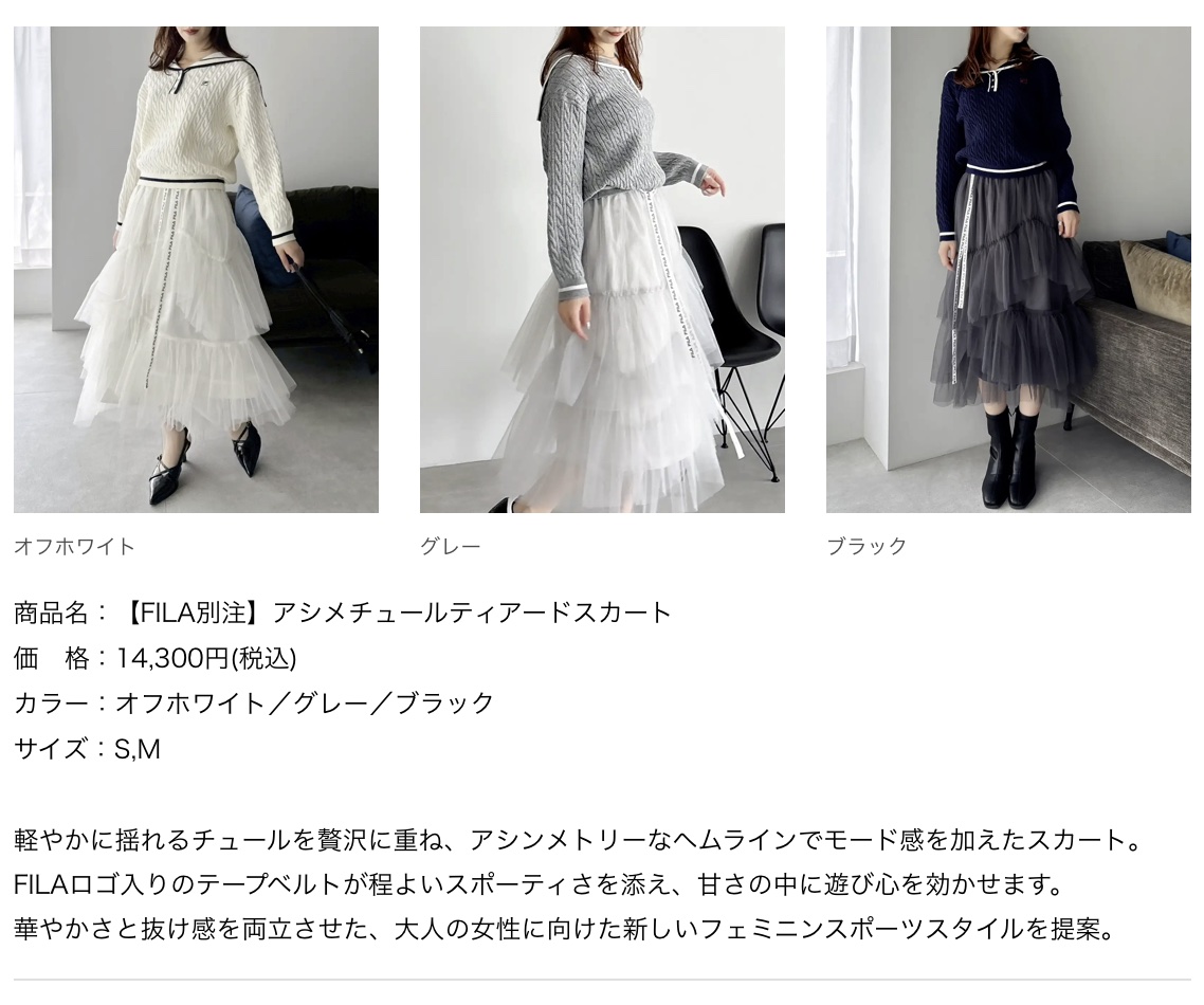 セーラーカラーやチュールスカートなどフェミニンな要素を引き立てるディテールに、FILAらしいロゴ使いやスポーティな配色をMIXしました。