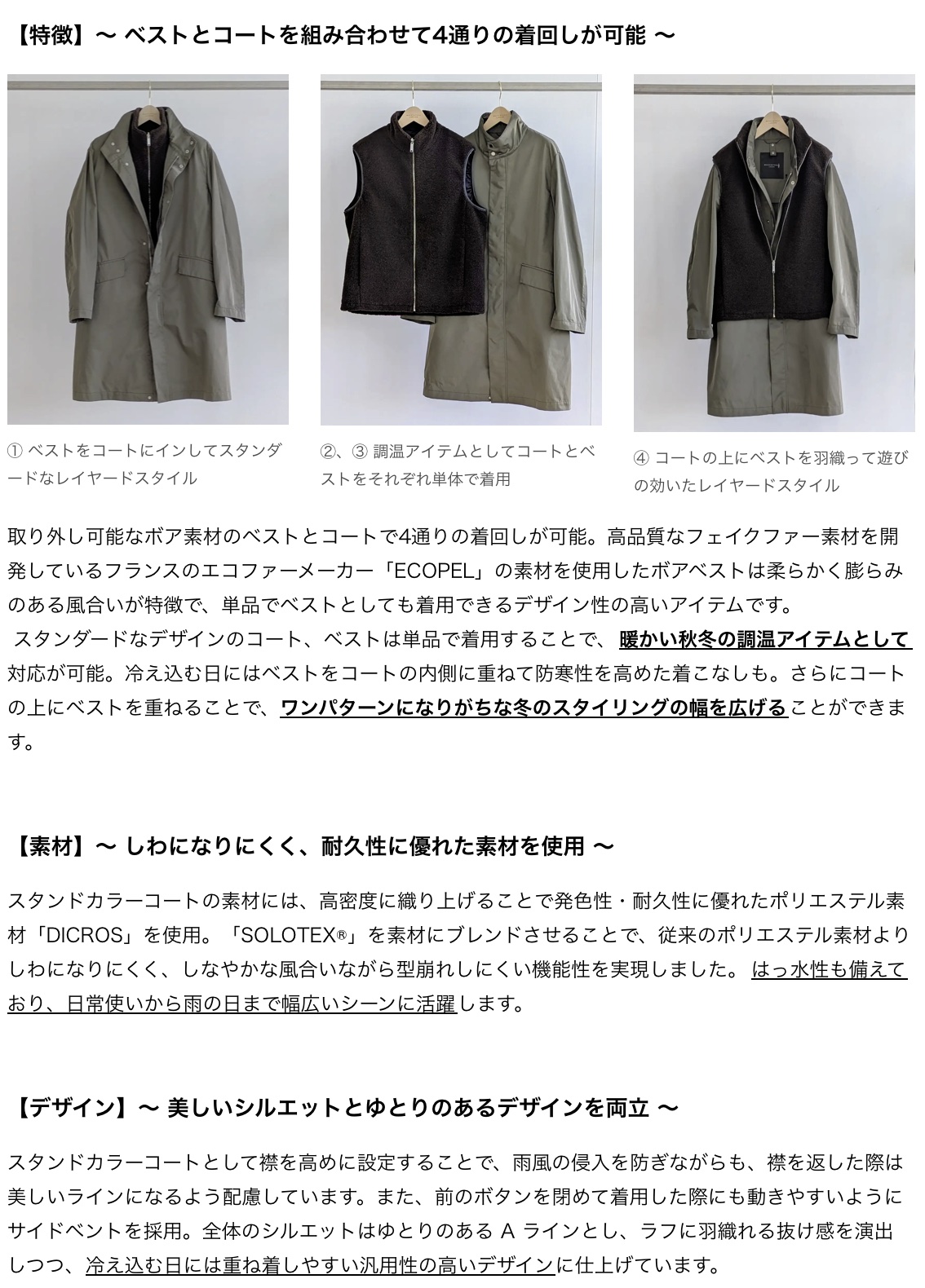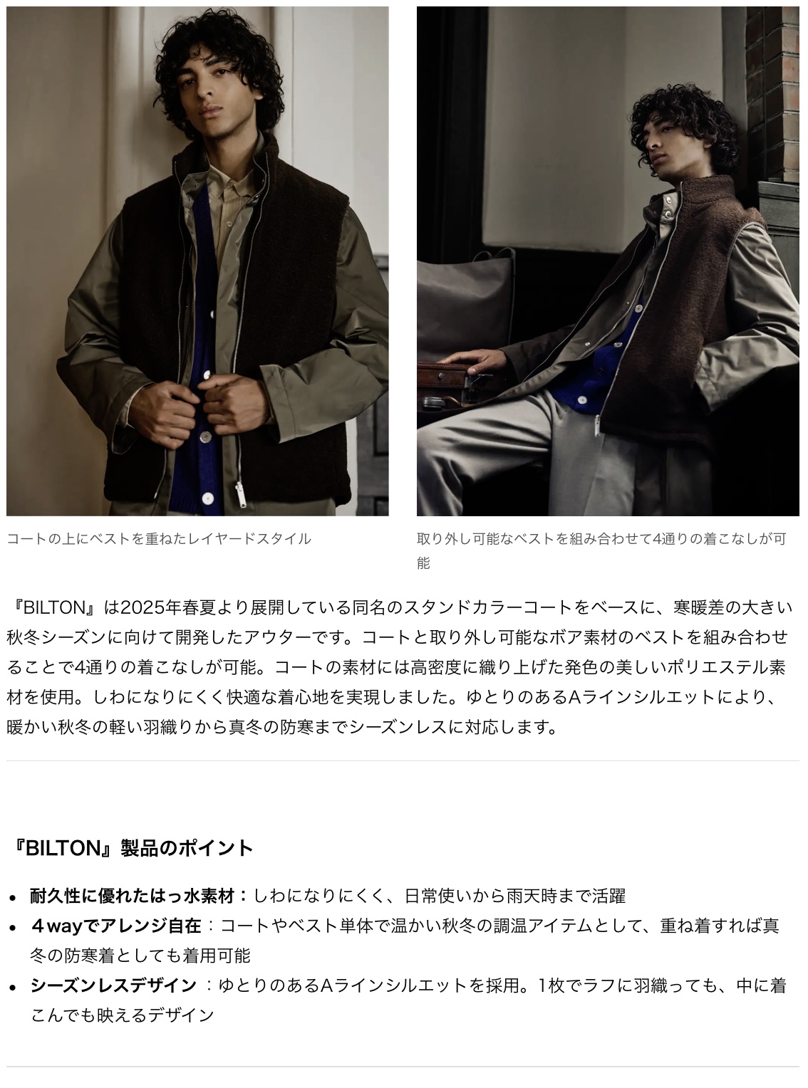 『BILTON』は、近年の気候変動による暖かい秋冬といった、気温変化の大きいシーズンに対応するために開発したアウターです。コートと取り外し可能なボア素材のベストを組み合わせることで、4通りの着こなしが可能。暖かい日にはコートやべストを単体で着用して調温アイテムとしても、冷え込む日には防寒着として活躍する汎用性を実現しました。