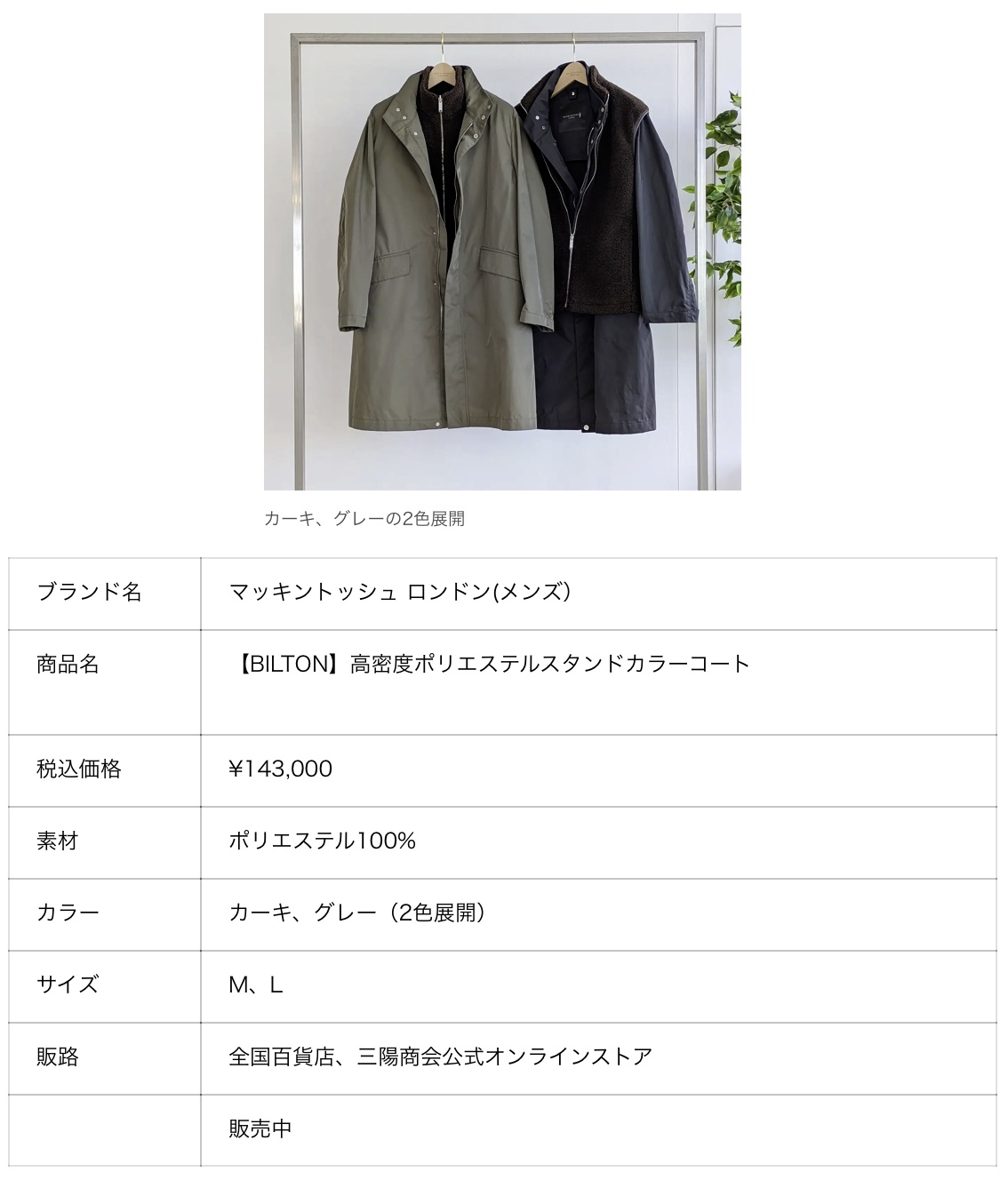 株式会社三陽商会 寒暖差に対応できる4WAYアウター『BILTON』を発売 「マッキントッシュ ロンドン」メンズ ~ 取り外し可能なベストでアレンジ自在。暖かい秋冬の調温アイテムから防寒着にも ~ (2025.10)