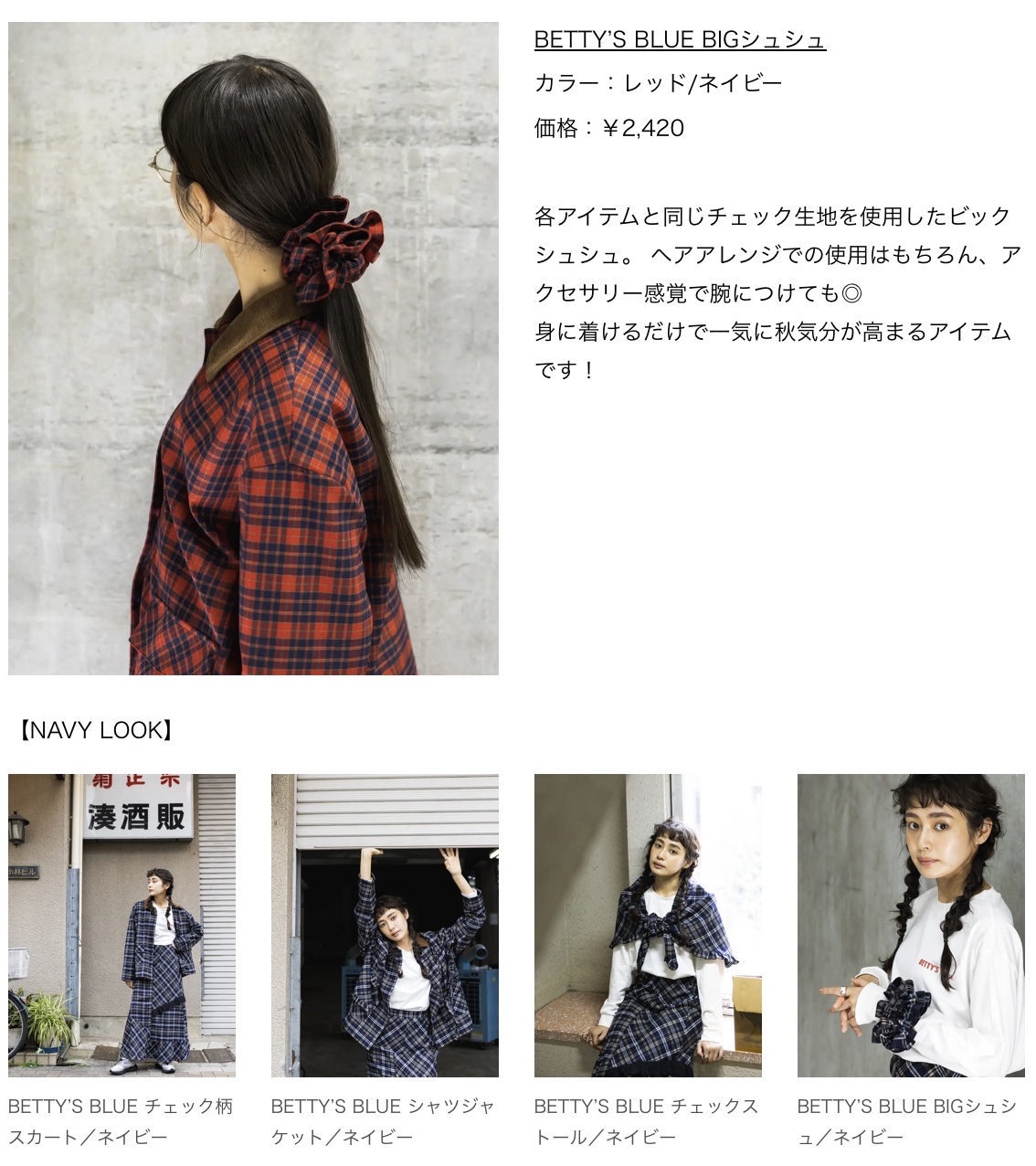 『BETTY’S BLUE REVIVAL COLLECTION』では、ブランドを象徴する“チェック”で統一したアイテムを4型ご用意いたしました。過去に販売され大人気だったパッチワークスカートは、今風にシルエットをアップデートし、ポイントのブラックレース使いは当時の雰囲気を再現。そのほか、同生地のシャツジャケットと自由自在にアレンジできる大判のストール、インパクトのあるビッグシュシュを展開いたします。