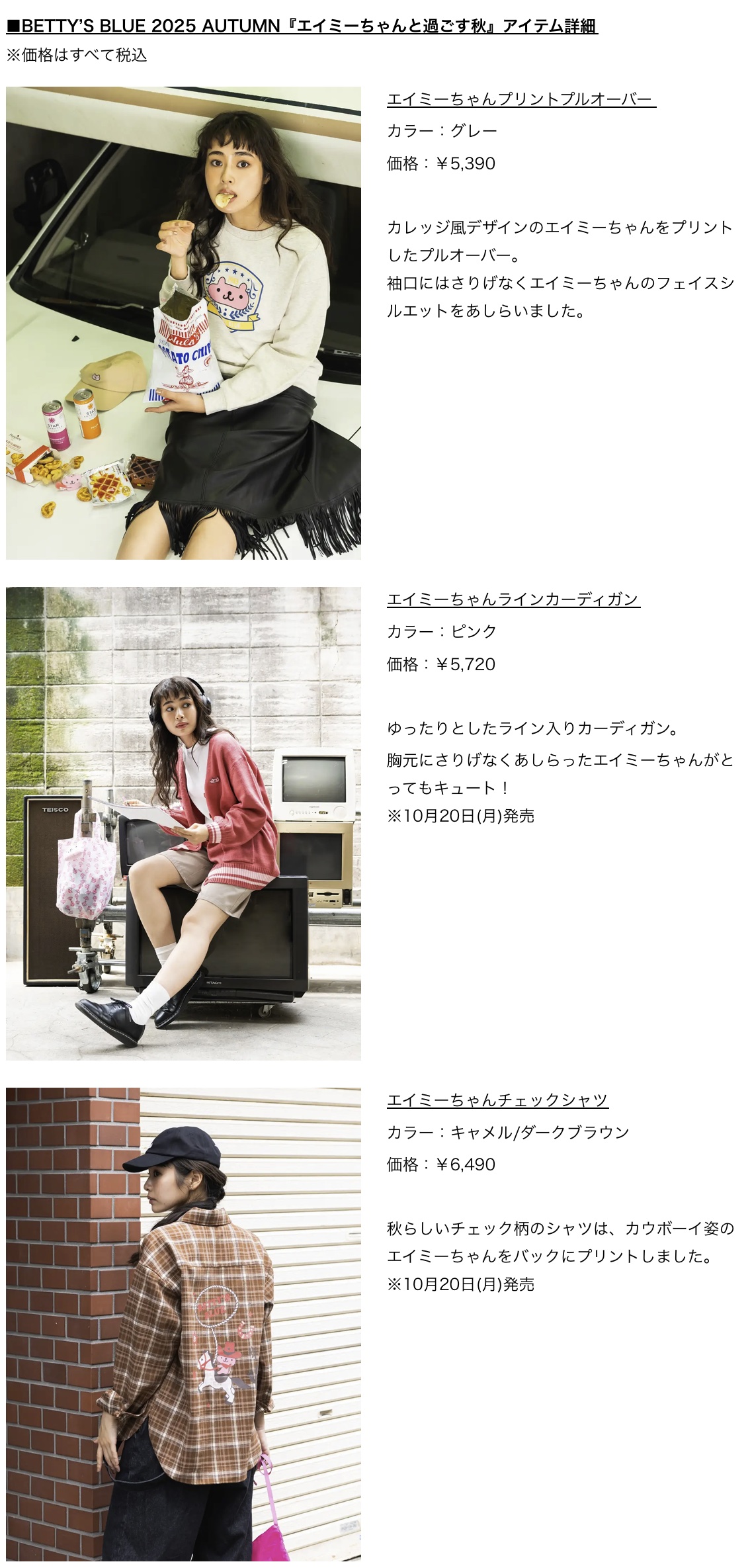 *「エイミーちゃんライン入りカーディガン」および「エイミーちゃんチェックシャツ」は、10月20日(月)発売予定