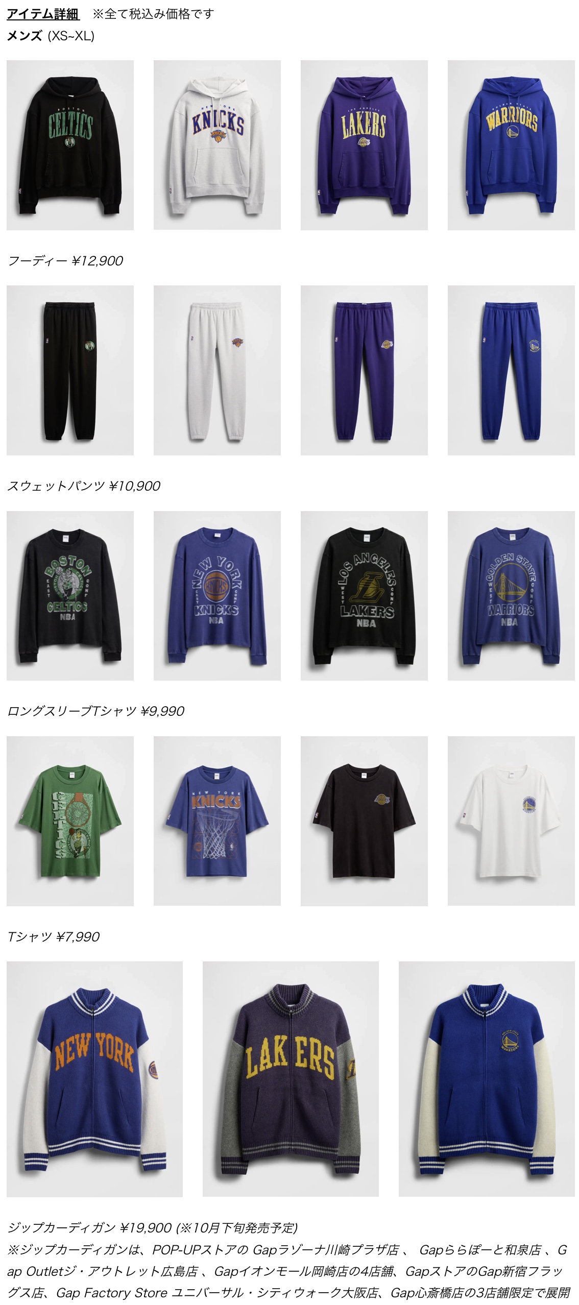 Gapは、NBA (ナショナル・バスケットボール・アソシエーション)との限定コラボコレクション「The NBA Collection」を発表します。今回のコラボレーションでは、リーグ創設以来、75年以上世界中で愛されてきたNBAの歴史をセレブレイトし、それぞれのチームロゴをGapのアイコニックなスタイルに落とし込んだコレクションを展開します。本コレクションは、2025年10月10日(金)よりポップアップストアで順次販売、2025年10月15日(水)より一部のGapストアと公式オンラインストア( https://www.gap.co.jp/ )で販売を開始します。価格帯は4,990円~19,900円(税込み)で、キッズから大人までのアパレルコレクションがラインナップします。
