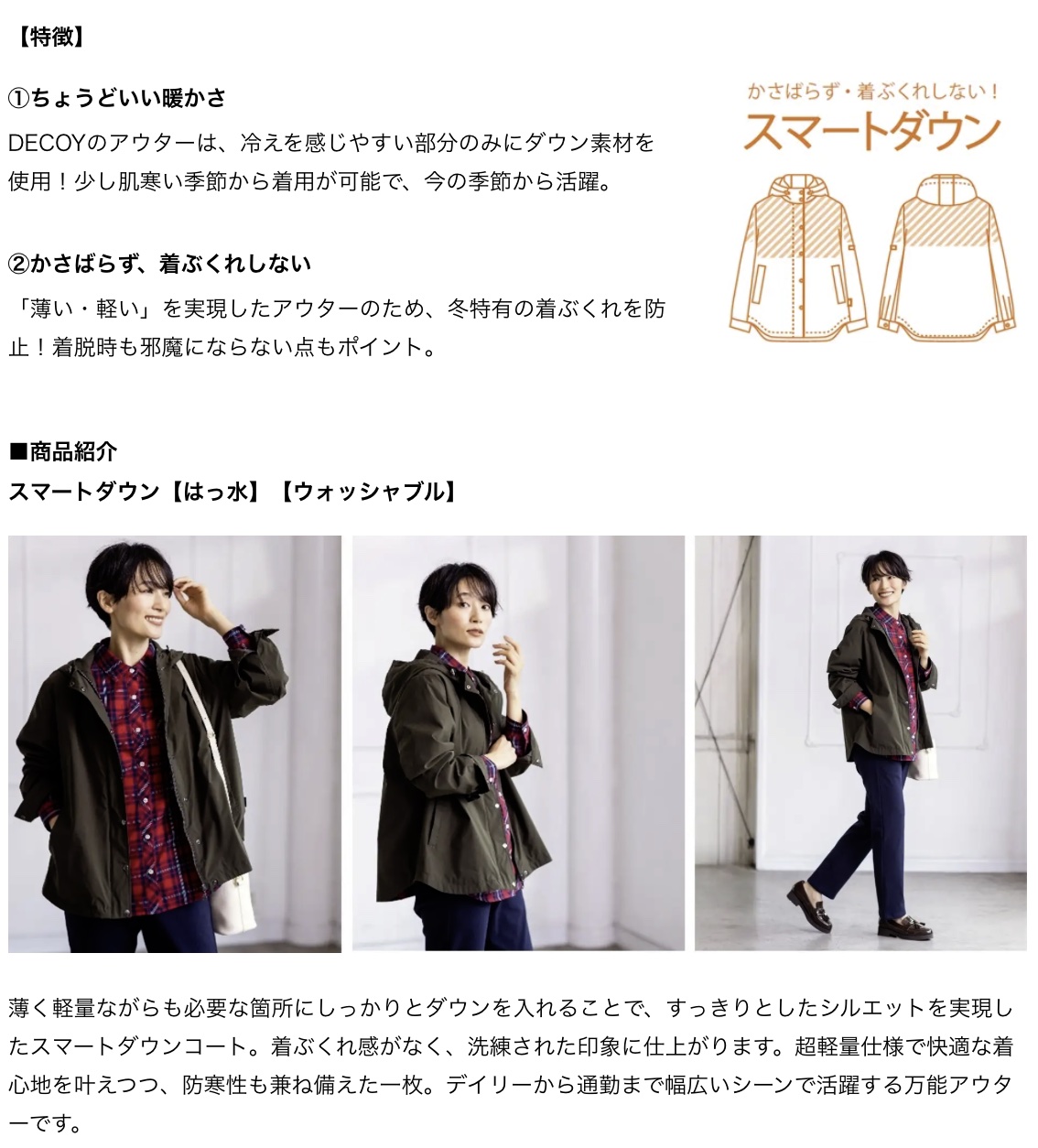 クロスプラス株式会社(本社:愛知県名古屋市、代表取締役社長:山本 大寛)が展開する、レディースブランド「DECOY」は、かさばり・着ぶくれを解消した「スマートダウン」を10月中旬より全国の「DECOY」販売店舗及びECサイトにて販売を開始いたしました。