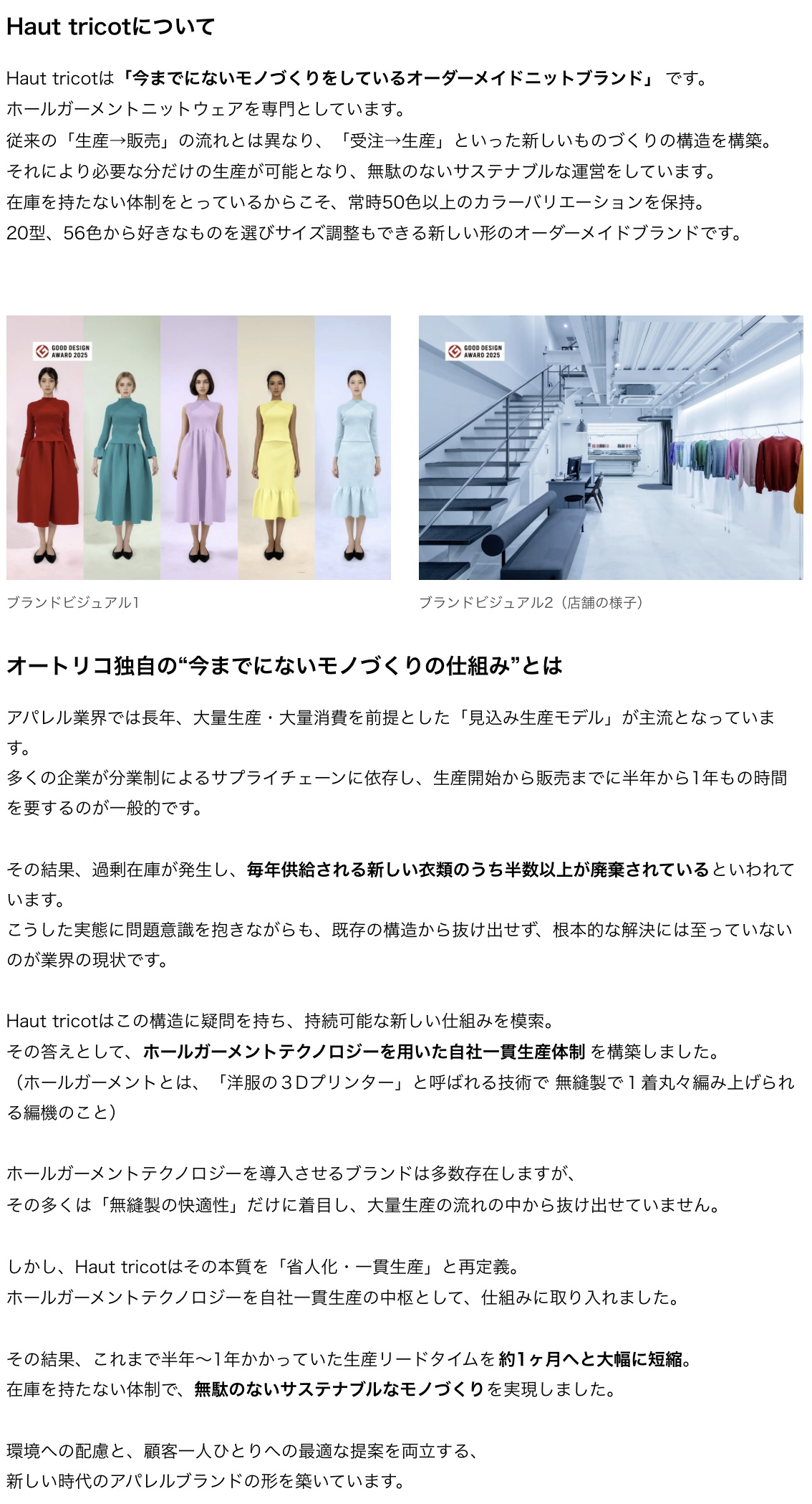 株式会社 ドゥフォワイエ Haut tricot(オートリコ)が2025年度グッドデザイン賞を受賞 ― アパレルブランドとして異例のプロジェクト評価 ファッションの構造を変える挑戦。オーダーメイドニットブランドの “服づくりのあり方” そのものがデザインとして評価される (2025.10)