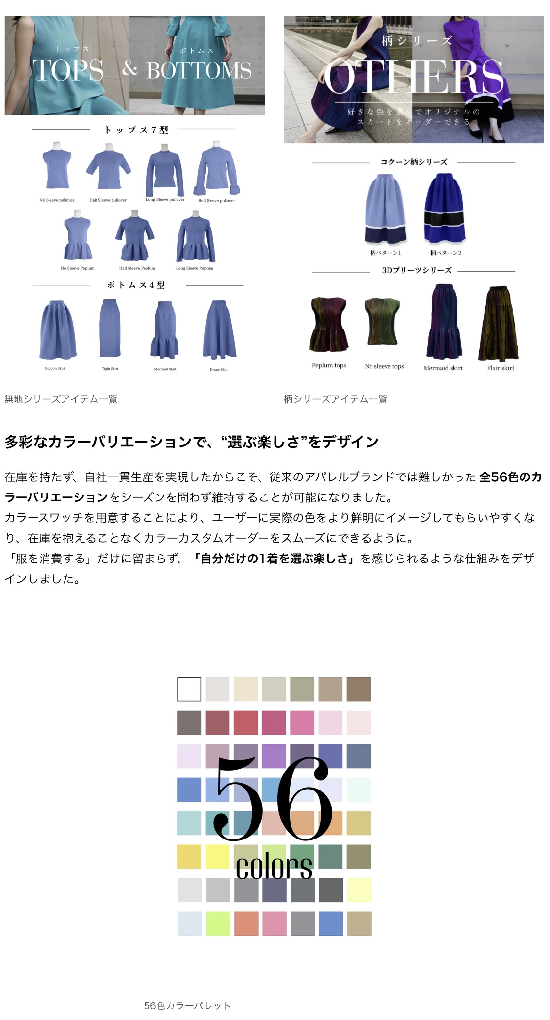 「工業製品としての洋服づくりのあり方への疑問が根底にあり、製造工程からサプライチェーン全体に新たな考え方を提案する挑戦的なプロジェクトと言える。同時に「無縫製による着心地の良さ」だけではなく、56色展開、約20型をベースにサイズや柄なども選んで豊富なカラーと型のバリエーションを提供し、オーダーメイドとデザインを両立させた点で優れている。服を選ぶ消費行動そのものにも一石を投じる可能性がある。」(原文ママ)