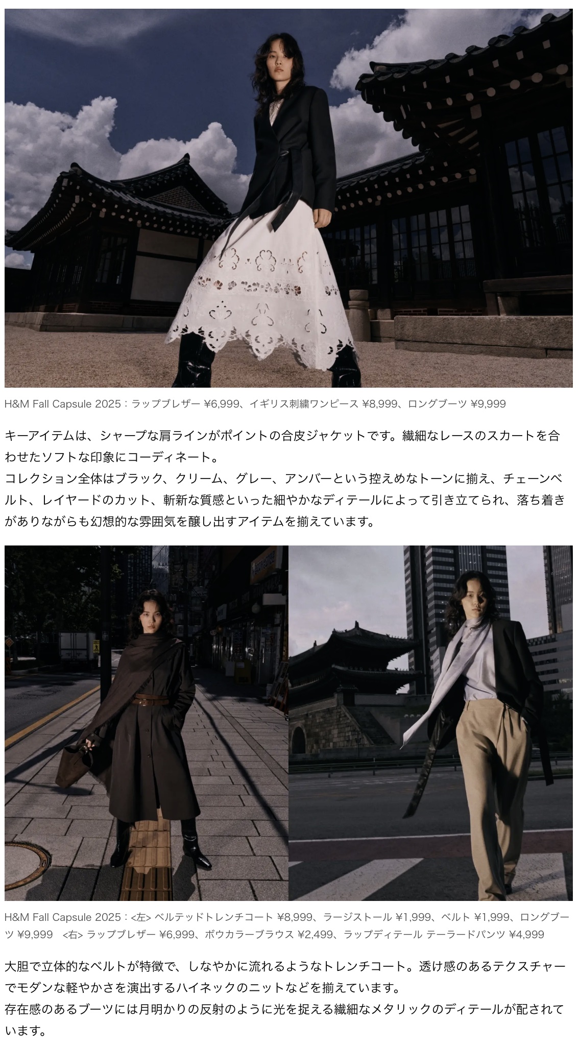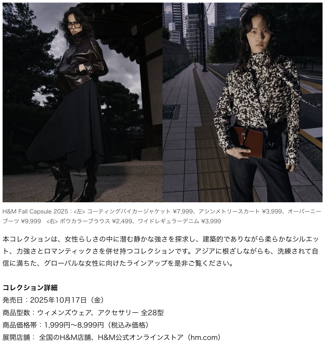 H&M H&M、秋のボヘミアンにインスパイアされたアジア地域限定カプセル・コレクション「Fall Capsule 2025」を発表 ロマンティックでエネルギー溢れる全28型を、10月17日(金)よりH&M店舗および公式オンラインストアにて発売。 (2025.10)