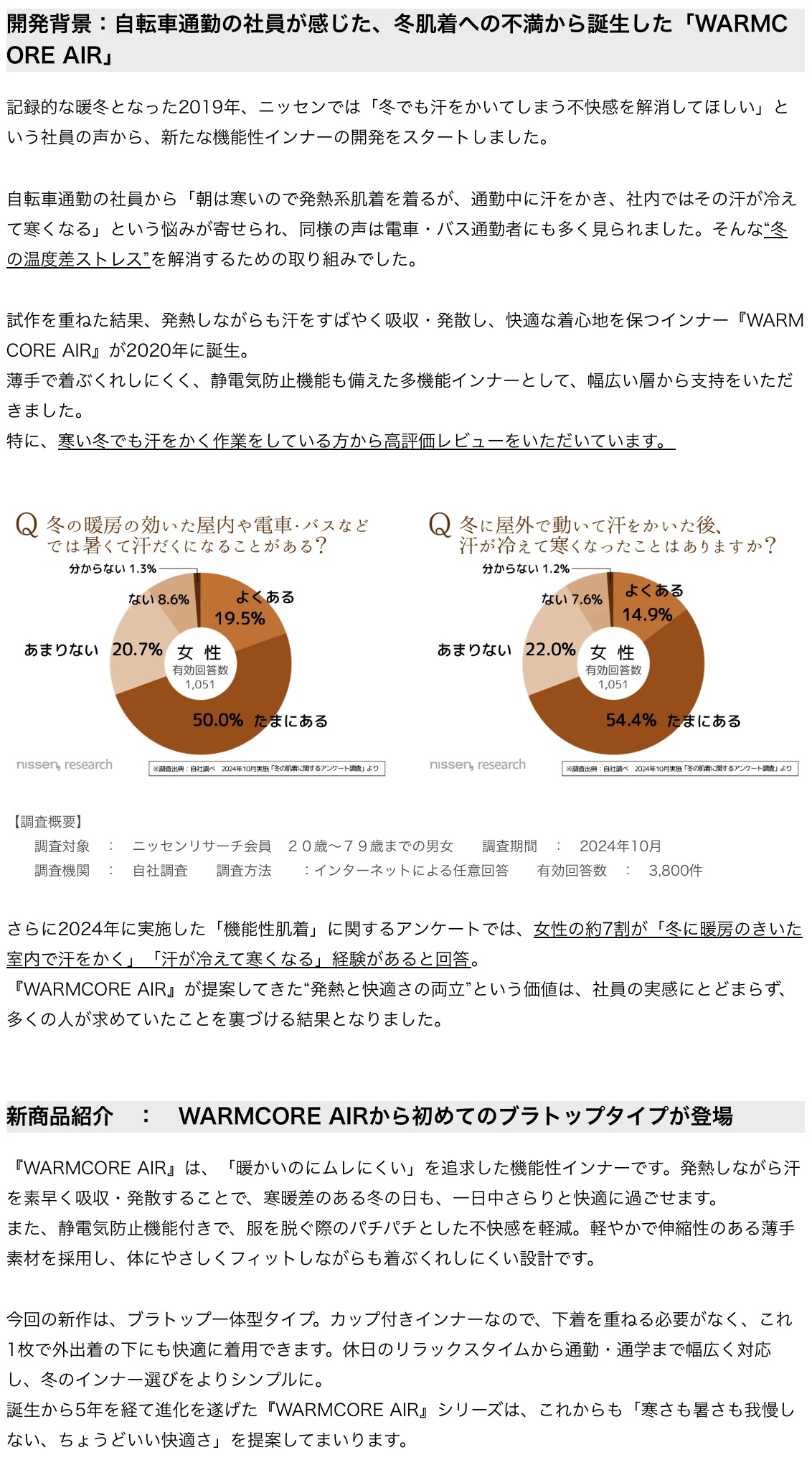 株式会社ニッセンホールディングス 7割の女性が感じている!冬の温度差ストレスを1枚で解消。発熱しながら汗を素早く発散するニッセンのオリジナルインナー『WARMCORE AIR』にブラトップタイプの新作が登場。 寒い冬の朝、必死で自転車こいで出勤したら汗かいた。厚着して出かけたら、ショッピングモールで汗だくになった。そしてその後に、汗が冷えてヒヤッとする!という経験ありませんか? (2025.10)