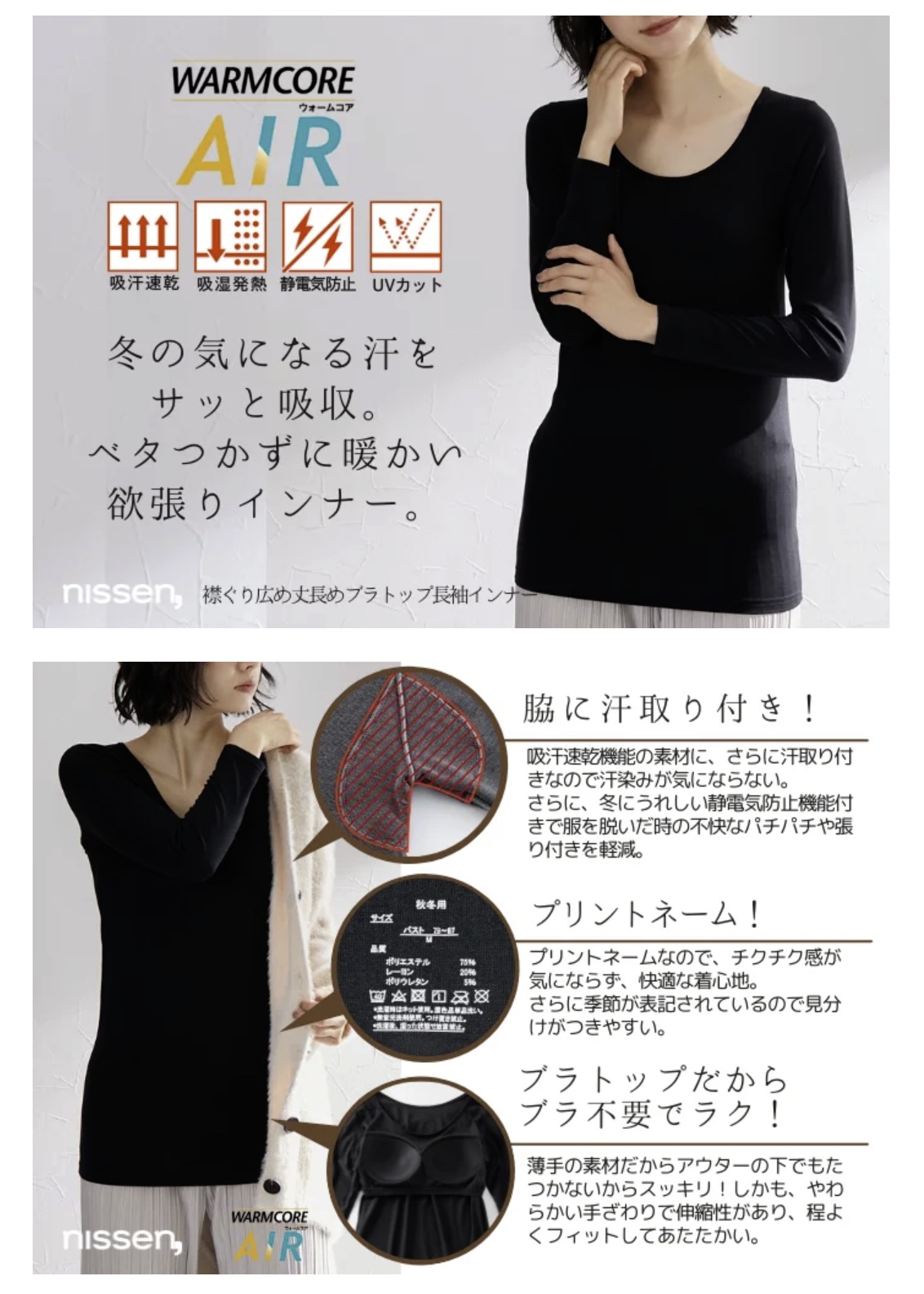 株式会社ニッセン(本社:京都市南区、代表取締役社長:羽渕淳)が展開する、あったかインナー『WARMCORE(ウォームコア)』シリーズにおいて、発熱しながら汗を素早く吸収・発散する『WARMCORE AIR(ウォームコアエアー)』にブラトップタイプの新作が登場しました。