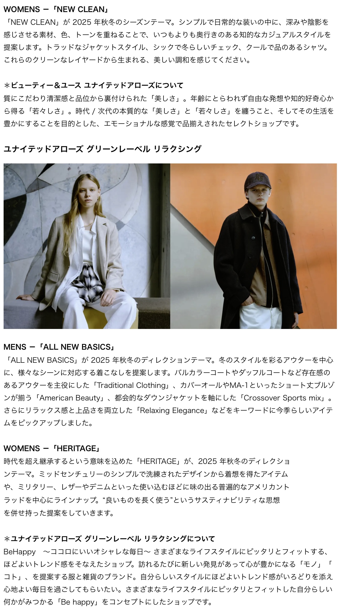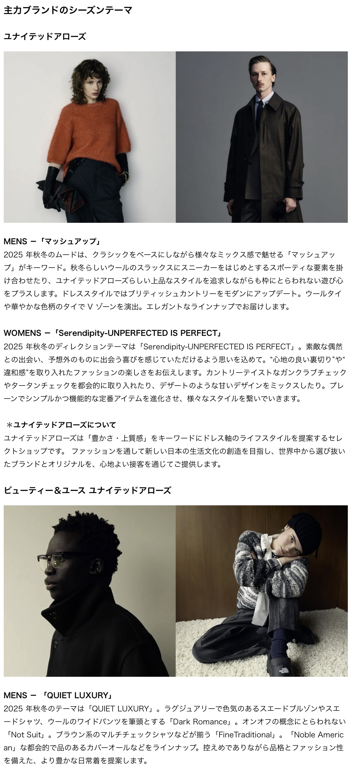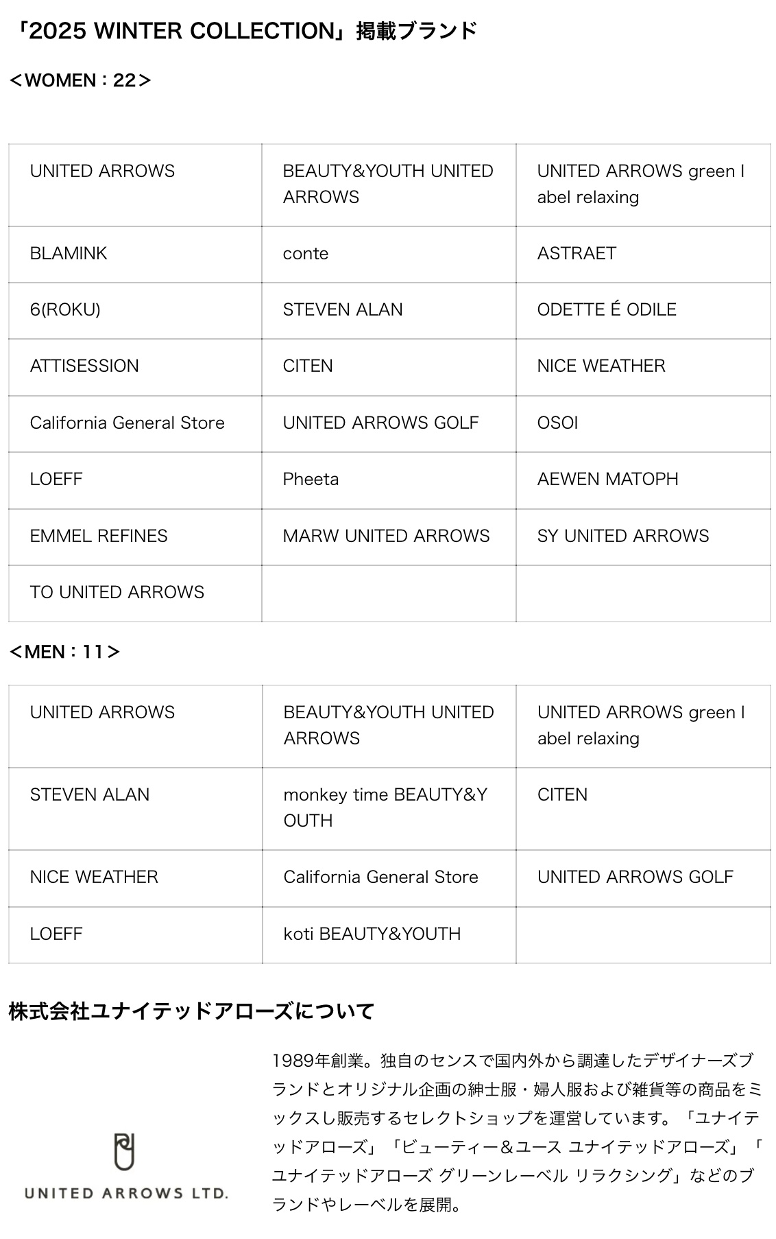 株式会社ユナイテッドアローズ 株式会社ユナイテッドアローズ「2025 WINTER COLLECTION」特設サイト公開 〜全33ブランドが集結、最新LOOKで冬のスタイルを一挙紹介〜 (2025.10)