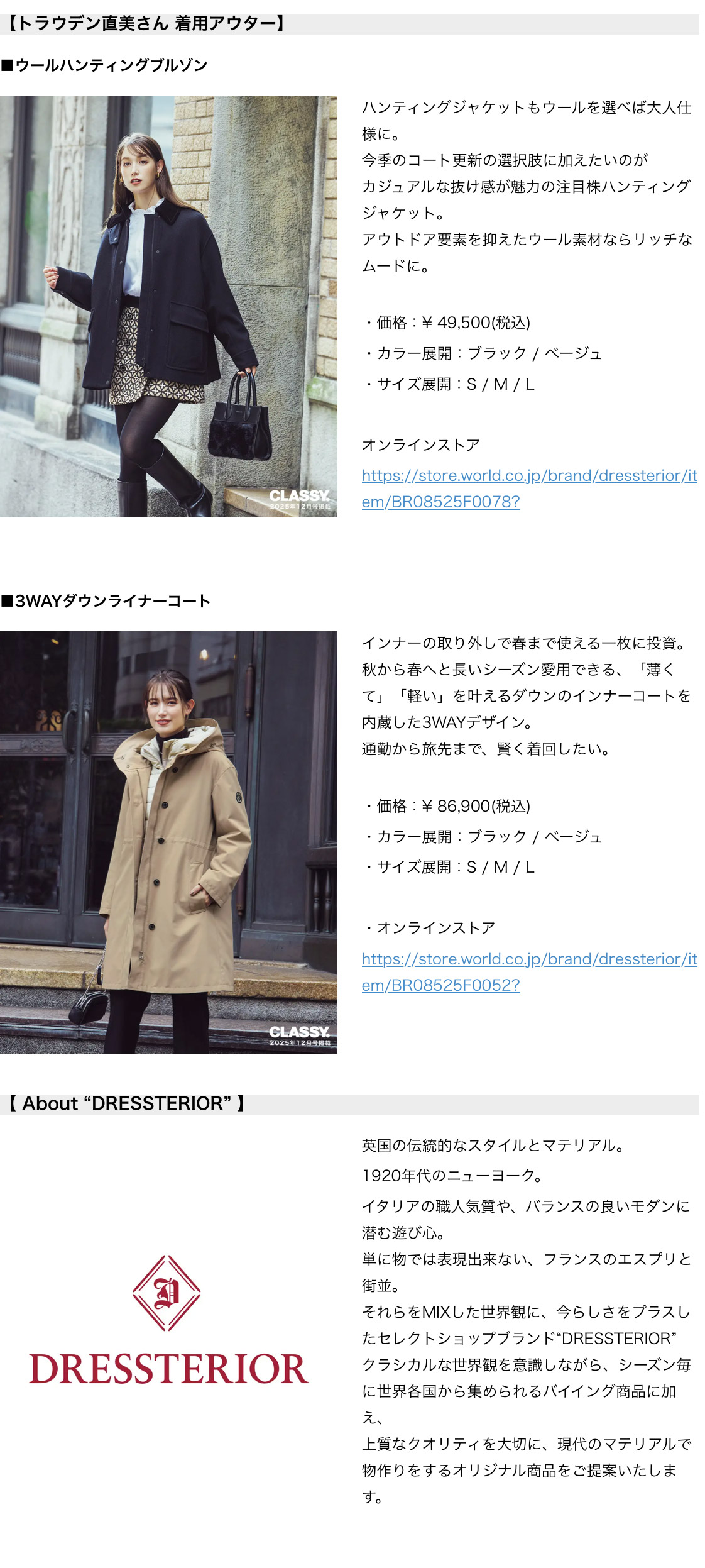 株式会社 ワールド 【DRESSTERIOR】トラウデン直美さんが着る「本命アウター」の特集ページを10月28日(火)よりオフィシャルサイトにて公開 (2025.10)