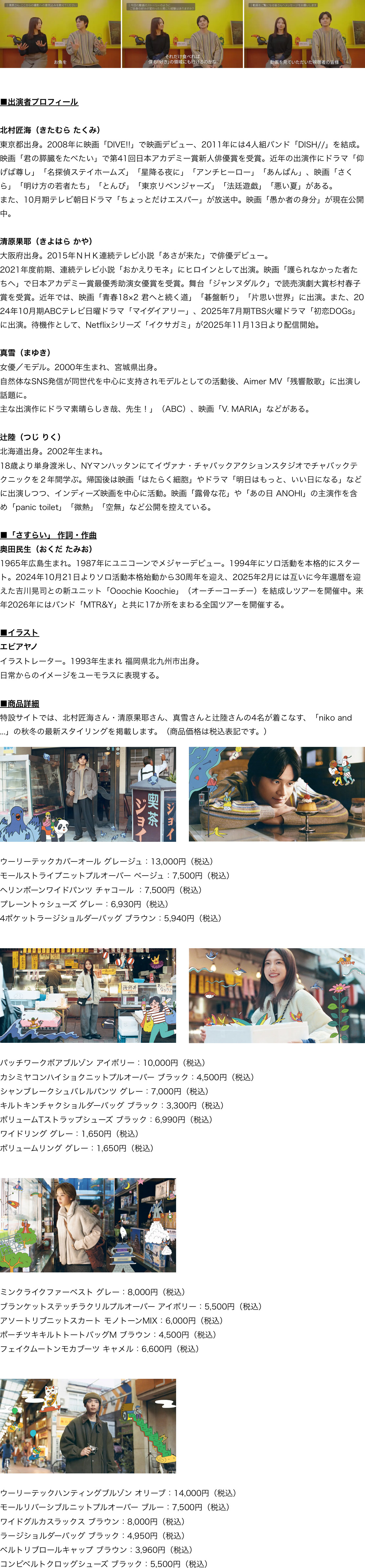 “Play fashion!”をミッションに掲げるアンドエスティHDグループで、40以上のマルチブランドを展開する株式会社アダストリア(本部:東京都渋谷区渋谷2-21-1、代表取締役社長:北村 嘉輝)のスタイルエディトリアルブランド「niko and ...(ニコアンド)」は、2025年10月30日(木)より、俳優の北村匠海さんと清原果耶さんが出演するキャンペーンムービーを特設サイトと「niko and ...」公式YouTubeチャンネル及び全国の「niko and ...」店舗にて公開いたします。