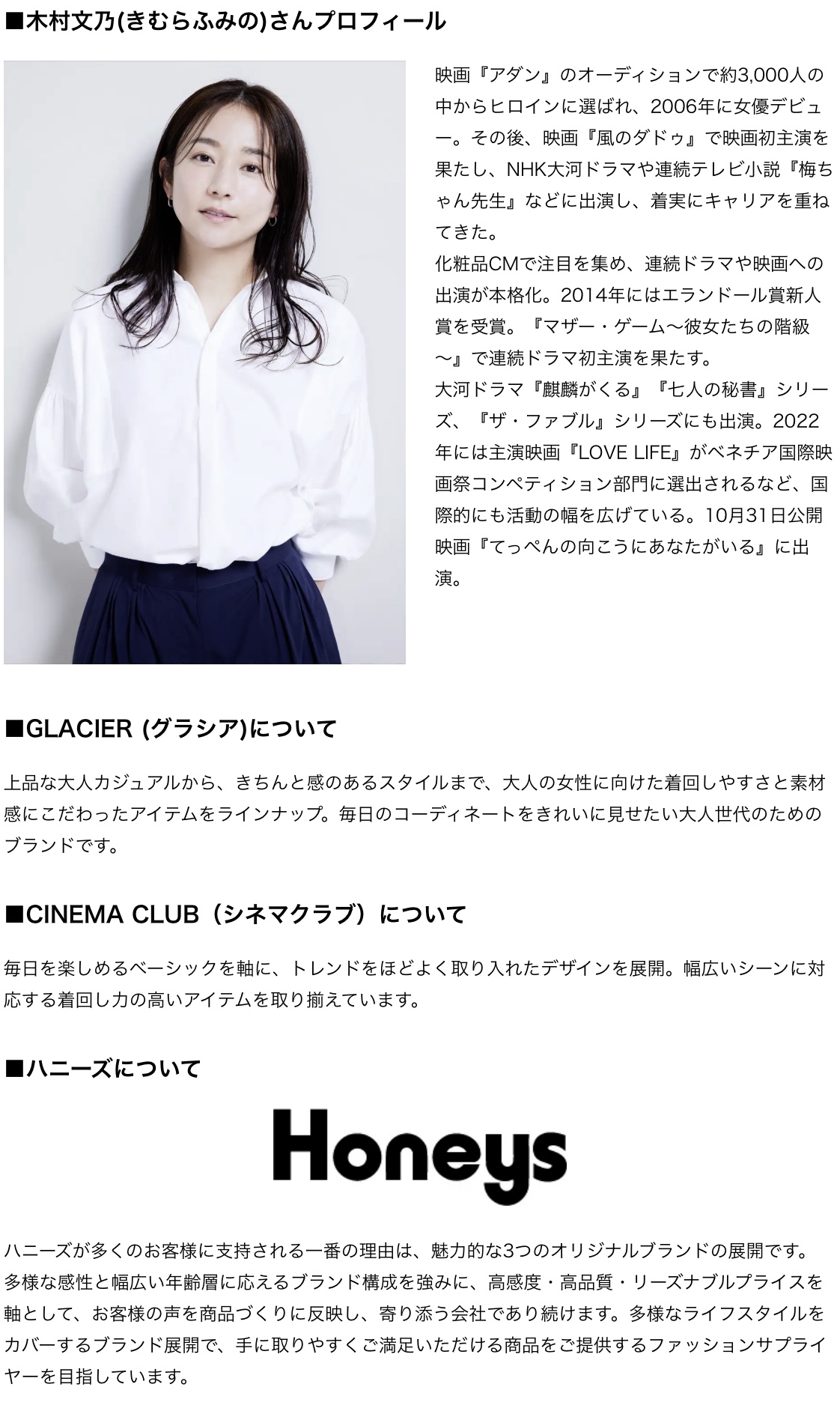 株式会社ハニーズホールディングス(本社所在地:福島県いわき市、代表取締役社長:江尻英介)が展開するレディースブランドHoneys(ハニーズ)は、俳優・木村文乃(きむらふみの)さんをイメージモデルに起用したGLACIER (グラシア)・CINEMA CLUB (シネマクラブ)の2025年冬の新作コレクションを、2025年10月31日(金) よりハニーズ公式オンラインショップにて公開しました。