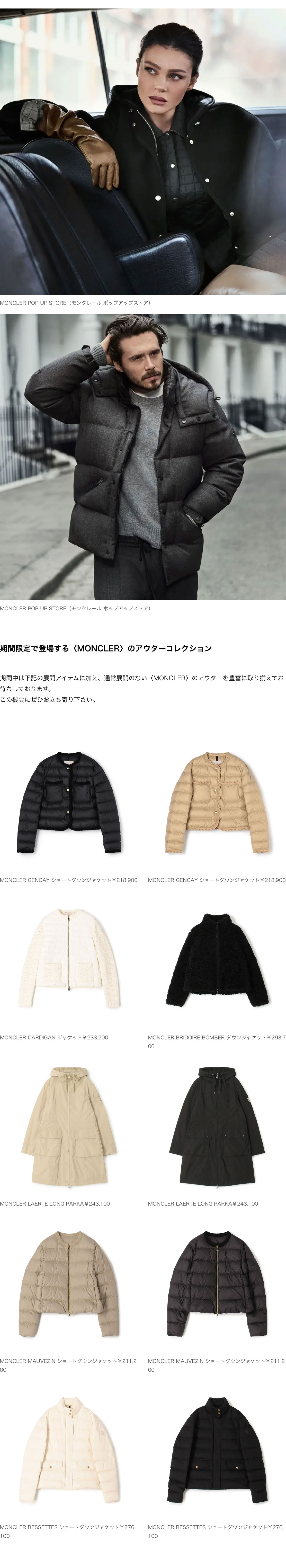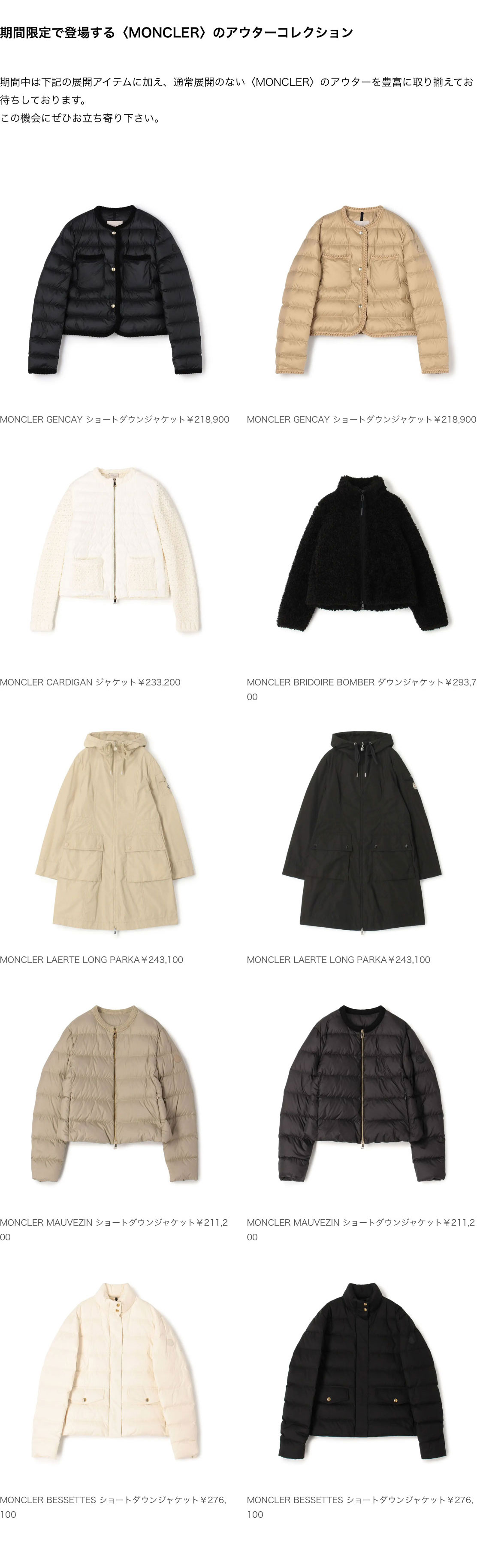 期間中は下記の展開アイテムに加え、通常展開のない〈MONCLER〉のアウターを豊富に取り揃えてお待ちしております。