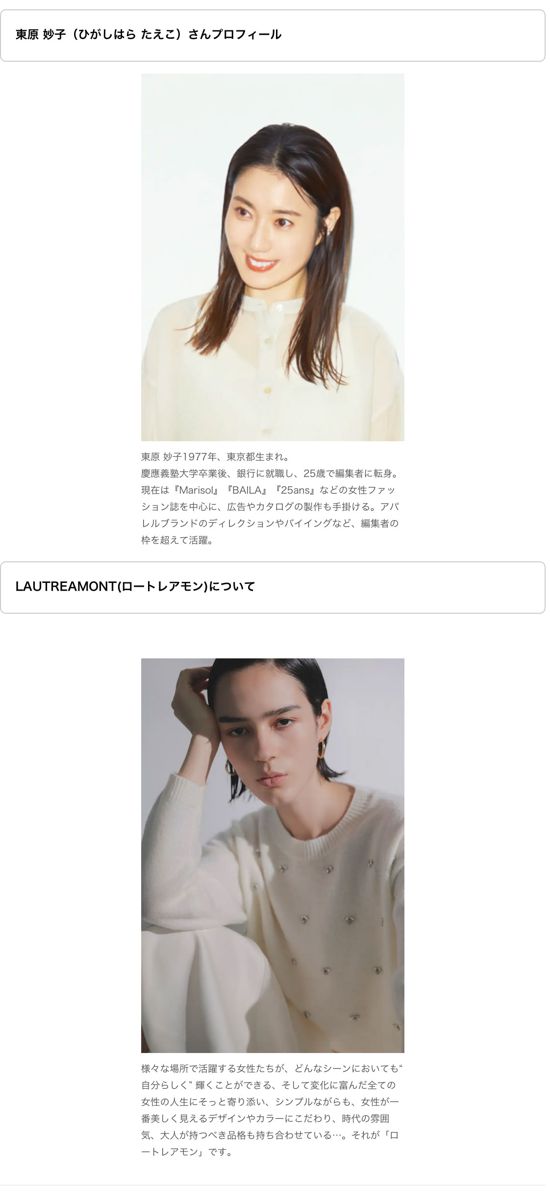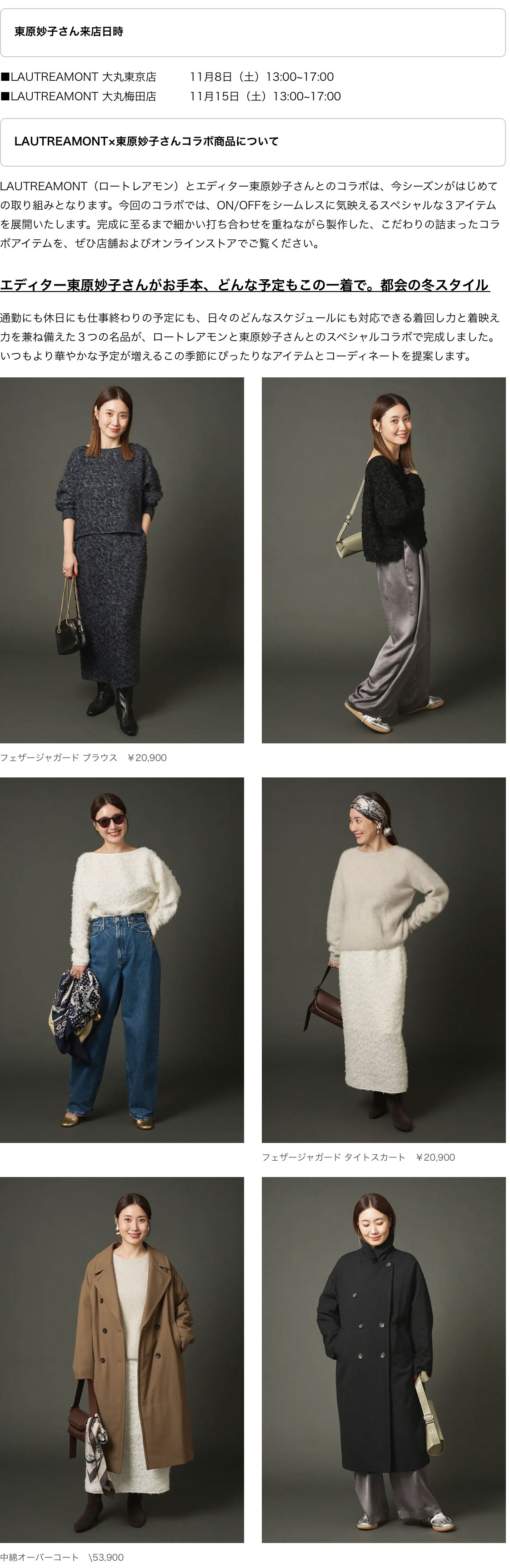 株式会社ジャヴァコーポレーション(神戸市中央区/代表取締役社長 浅見 幸正)が運営するレディースブランド「LAUTREAMONT(ロートレアモン)」は、エディター東原妙子さんとの初コラボレーションを記念して、11月8日(土)大丸東京店、11月15日(土)大丸梅田店にて、東原さんをお招きし店頭イベントを開催します。33,000円以上お買い上げいただいた方にはプレゼントの特典もございます。※数量限定の為、無くなり次第終了となります。予めご了承ください。