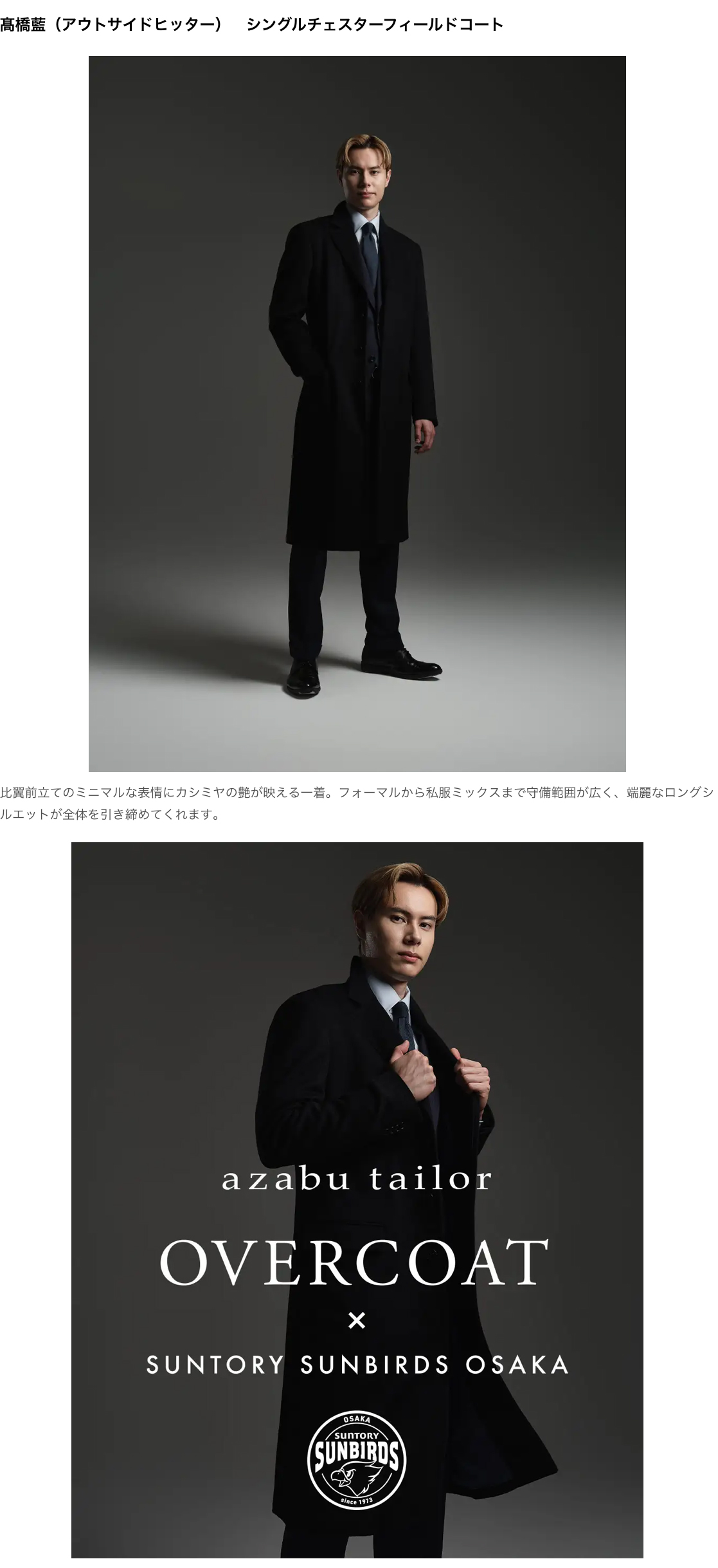 アスリートが私服に着替える瞬間を想像し、麻布テーラーのオーダーコートで構成したスタイリングを制作。サントリーサンバーズ大阪の選手が異なるコートモデルを着用し、王道デザインの振り幅と現代性を表現しました。