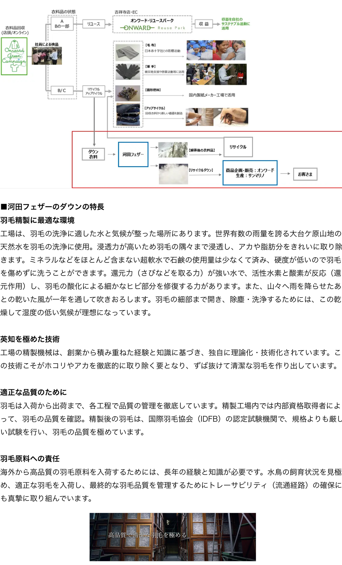 当社と河田フェザーは、新たな循環リサイクルについて数年前から継続的に協議してきましたが、この度、当社のポリシーである“廃棄をせずに循環させる”システムを実現することができプロジェクトをスタートしました。「オンワード・グリーン・キャンペーン」で回収したダウン衣料を河田フェザーでリサイクルダウンとしてよみがえらせ、ダウンを取り除いた解体後の衣料品を再度当社が回収し、固形燃料などに活用します。リサイクルダウンを使用したアイテムの商品企画と販売をオンワード樫山、生産をサンマリノが行います。今秋冬シーズンは、レディスブランド『自由区』『23区』のジャケット、コートの一部アイテムに採用しました。