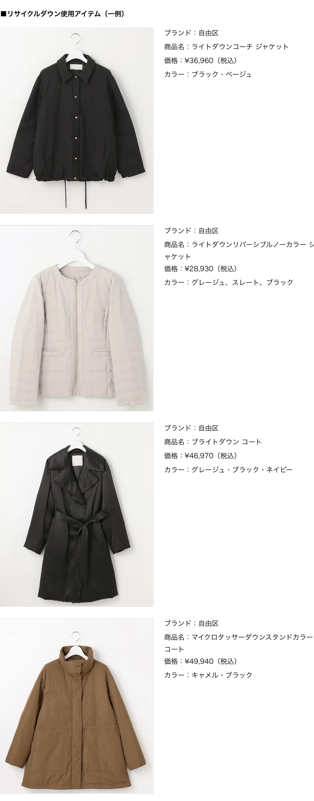 株式会社オンワード樫山(本社:東京都中央区 代表取締役社長:保元 道宣)は、河田フェザー株式会社(本社:三重県明和町 代表取締役社長:河田 敏勝、以下「河田フェザー」)、株式会社サンマリノ(本社:東京都千代田区 代表取締役社長:貞永 明彦、以下「サンマリノ」)と衣料品循環の幅を広げるため、リサイクルダウンプロジェクトをスタートし、リサイクルダウンを使用したアイテムをレディスブランド『自由区』『23区』において販売を開始しました。