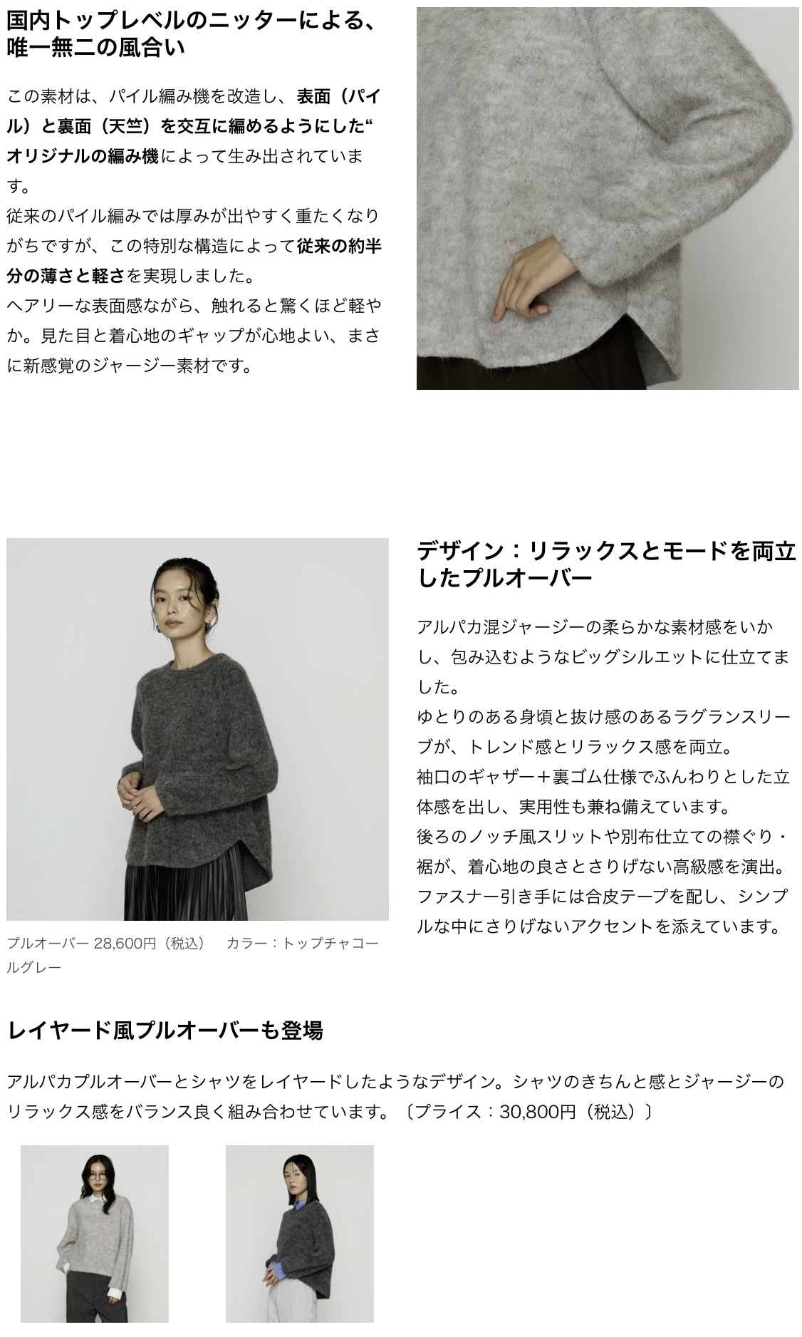 昨年多くのファンを魅了したオリジナルのアルパカ混ジャージーのプルオーバーが、今年は新色のトップライトグレーとトップチャコールグレーで登場します。ふんわりと柔らかいのに軽やか。高級感あるアルパカの表情と、希少な編み技術が光る日本製のアイテムです。11月13日(木)より、コムサ・ステージ、コムサ・プラチナ各店舗および公式オンラインストアにて販売します。