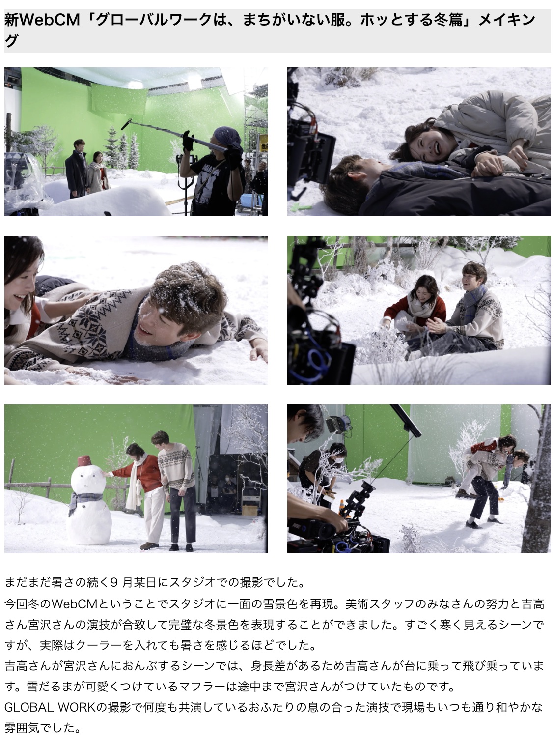 株式会社アンドエスティHD 吉⾼由⾥⼦さん・宮沢氷⿂さんが出演する新WebCM「グローバルワークは、まちがいない服。ホッとする冬篇」が11⽉13⽇(⽊)より放映開始︕ 雪降る寒さの中で無邪気にはしゃぐふたりがGLOBAL WORKの「ホッとする冬、ホッとなる服。」であたたかく。 (2025.11)