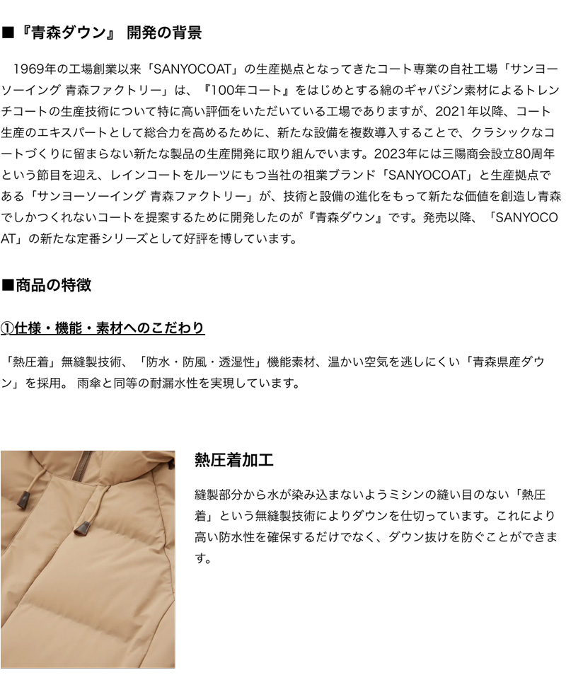 三陽商会が展開するコート専業ブランド「SANYOCOAT(サンヨーコート)」は、貴重な青森県産のダウンを使用し、コート専業56年の自社工場「サンヨーソーイング 青森ファクトリー」(青森県七戸町)でダウンの充填から製品化まで一貫して行った『青森ダウン』の2025年冬新作を、表地を刷新しさらにソフトで軽量なモデルへとアップデートして、店舗及び当社公式オンラインストア等にて販売を開始しました。
