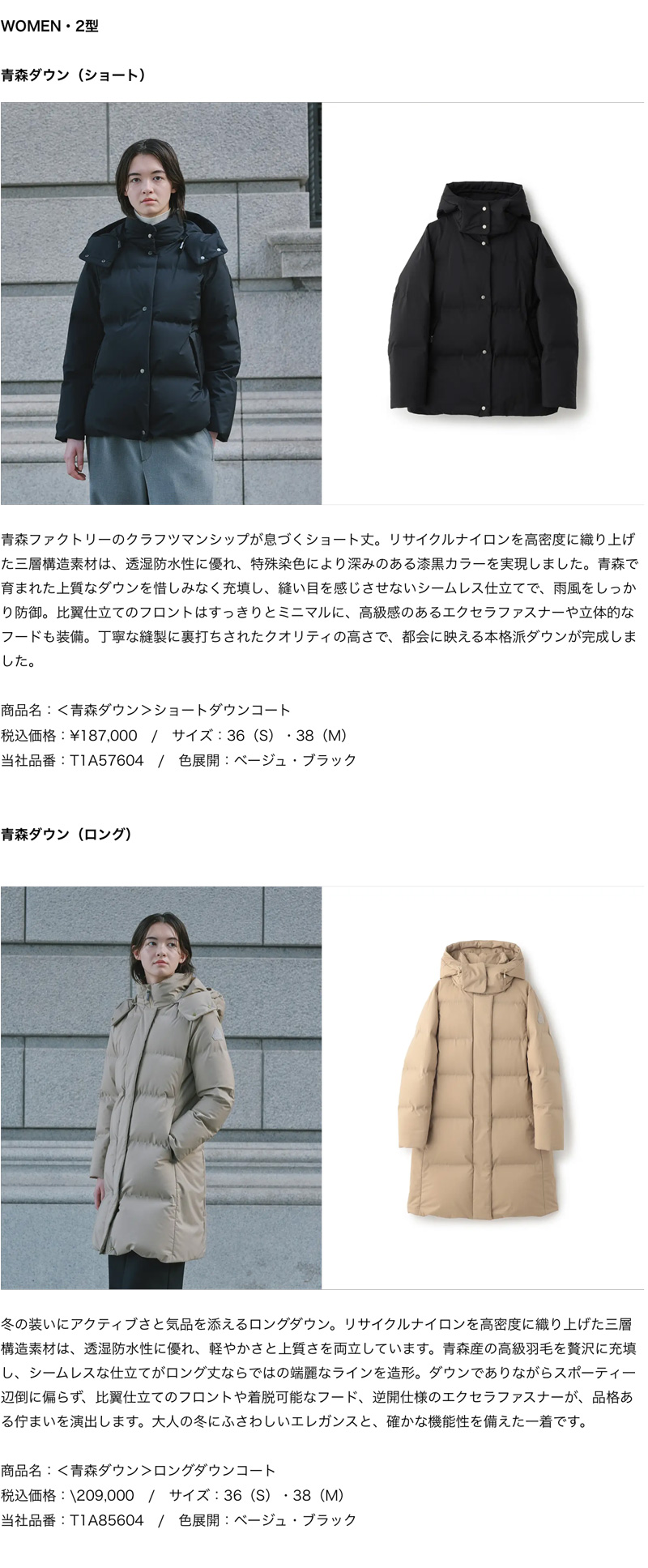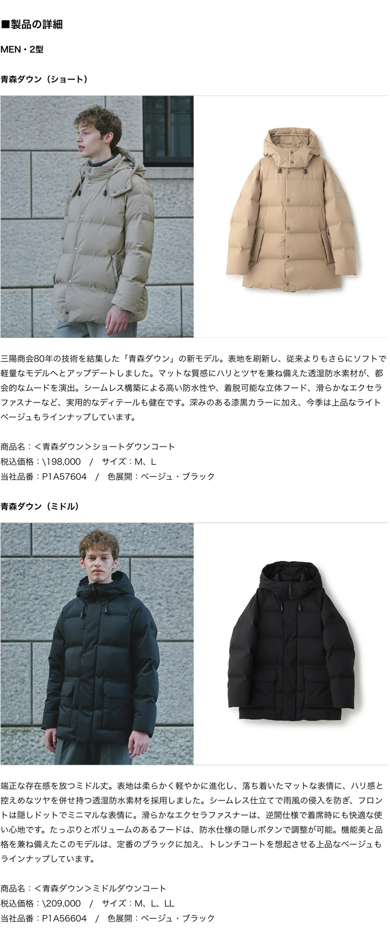 株式会社三陽商会 ダウンコートの最高峰を目指して開発した『青森ダウン』2025年冬の新モデルを発売 雨風を防ぎ、雪をもしのぐ青森ファクトリー発・高機能ダウン (2025.11)