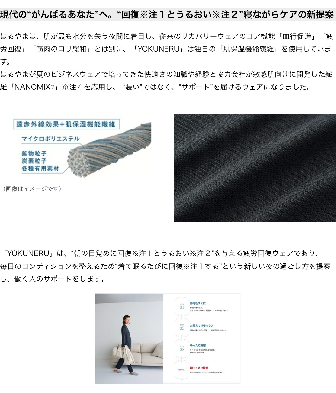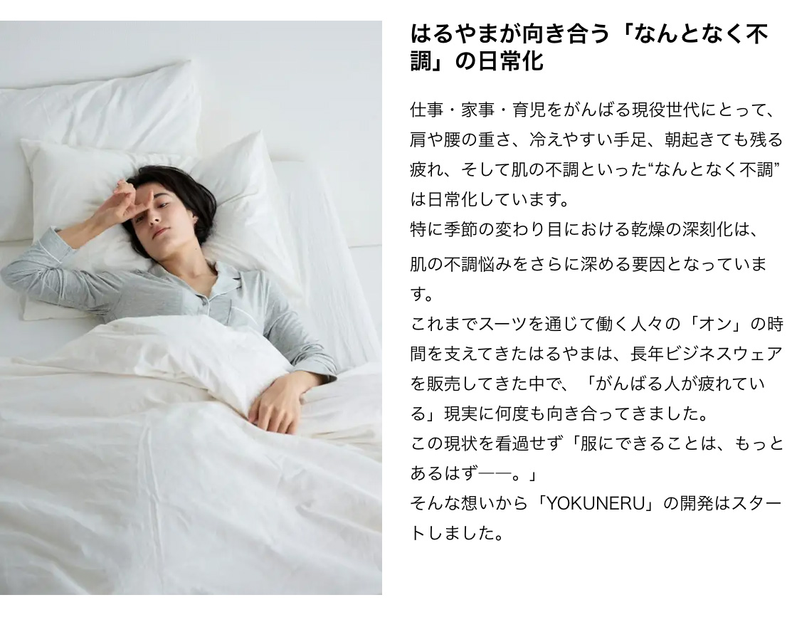 株式会社はるやまホールディングス 現代の“がんばる”あなたへ。“毎日の生活に、回復※注1とうるおい※注2”の新提案!寝ている間に肌とカラダをサポートする疲労回復ウェア「YOKUNERU」がスーツのはるやまから新登場 〜11月19日(水)より楽天市場にて販売開始〜 (2025.11)