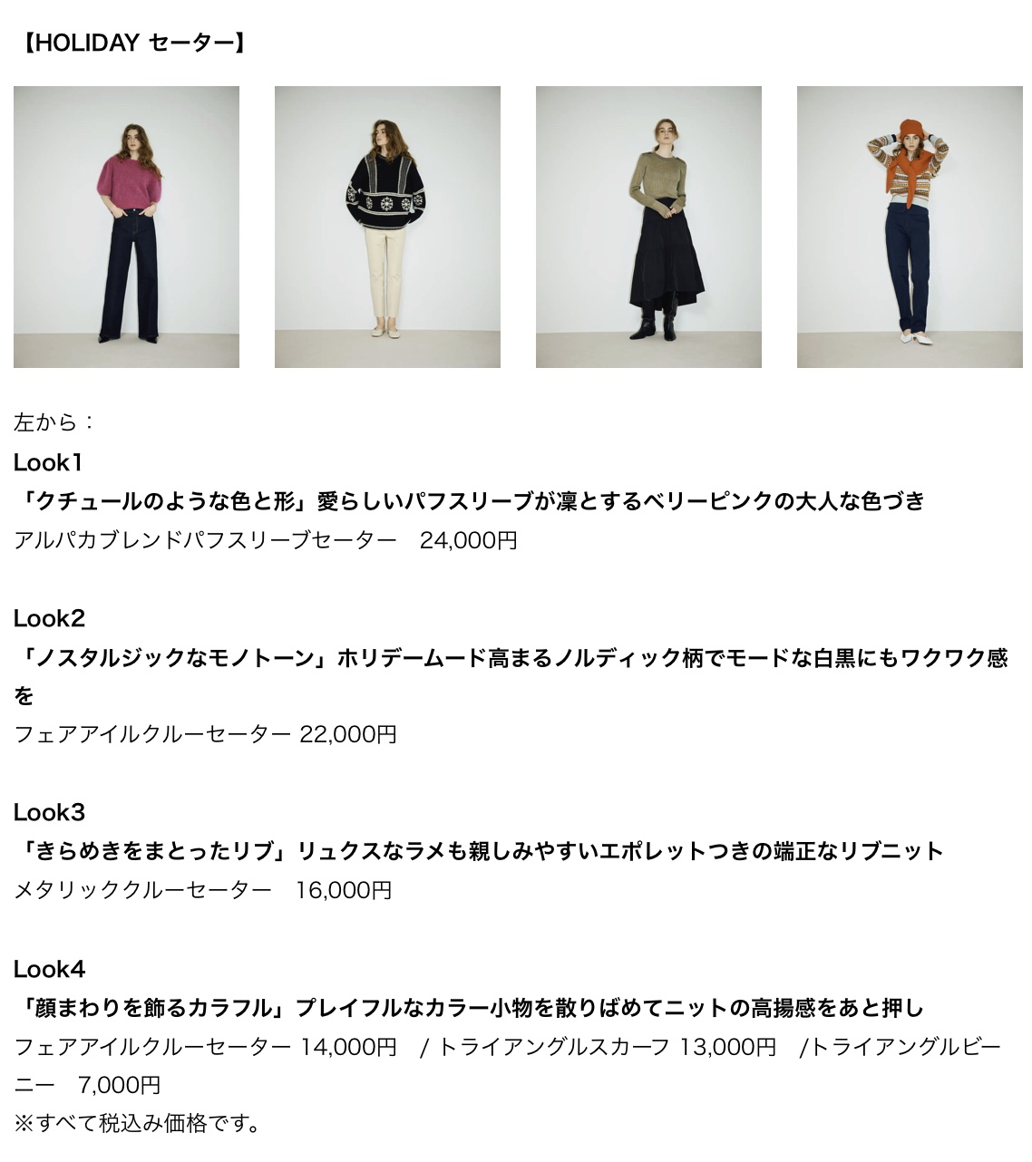 さらに、アルパカブレンドやメタリック、フェアアイルといった纏うだけで華やかなデザイン性に優れたホリデームードを高めるセーターが揃います。
