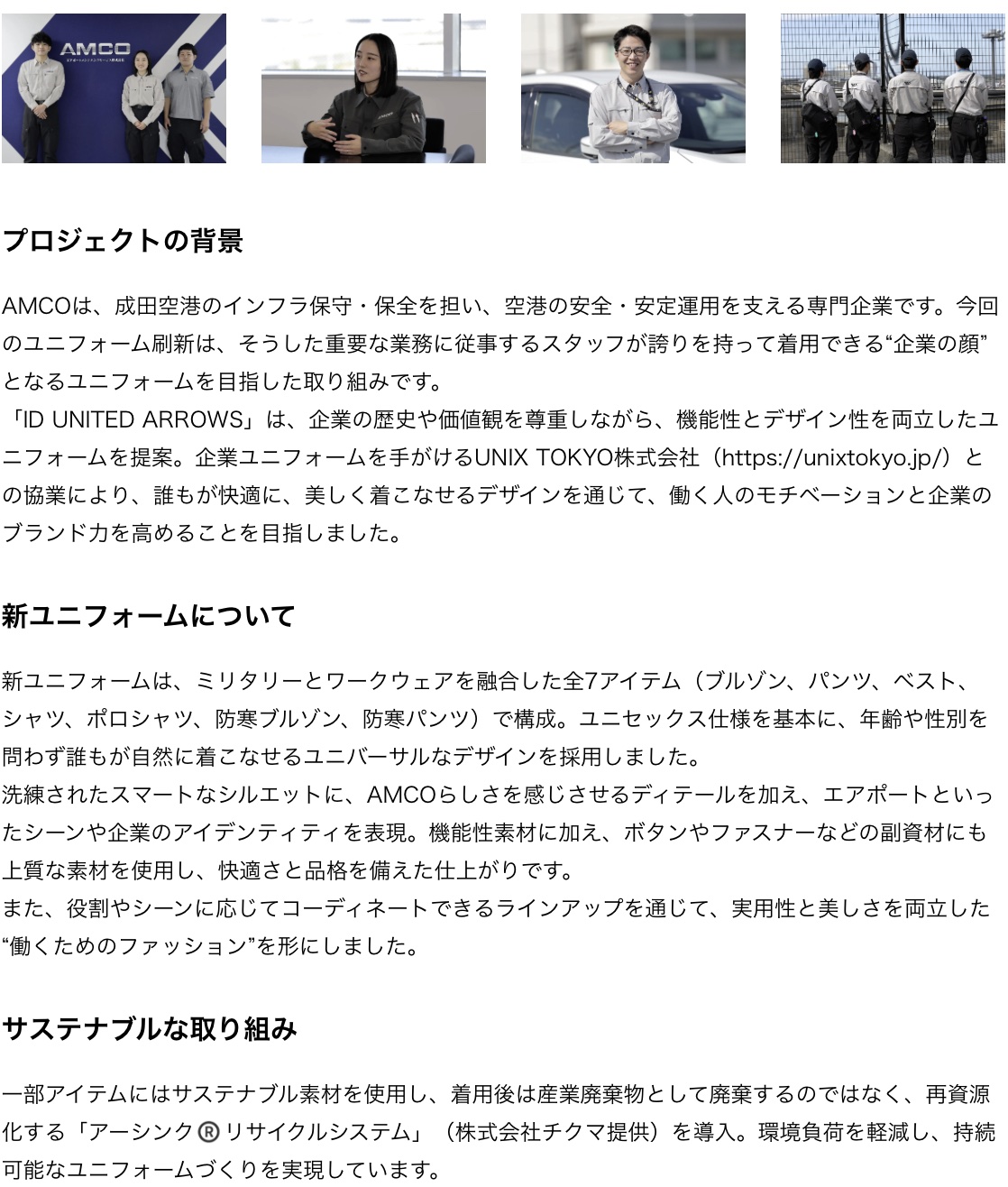 株式会社ユナイテッドアローズ 働く人の声から生まれた、企業の「顔」になる新ユニフォーム、AMCO × ID UNITED ARROWS 創立40周年を機に成田空港の現場を支えるユニフォームを刷新 (2025.11)