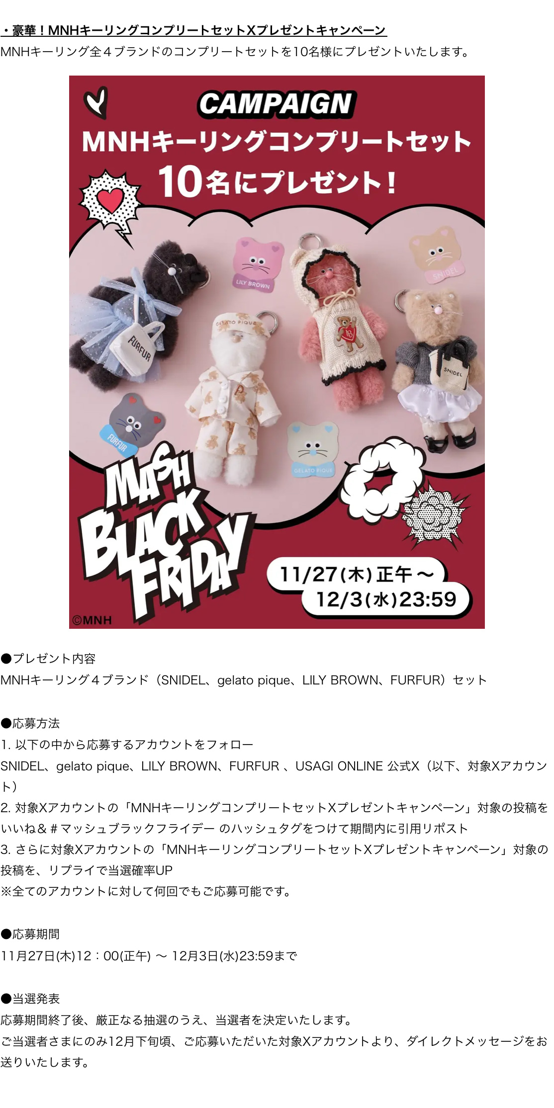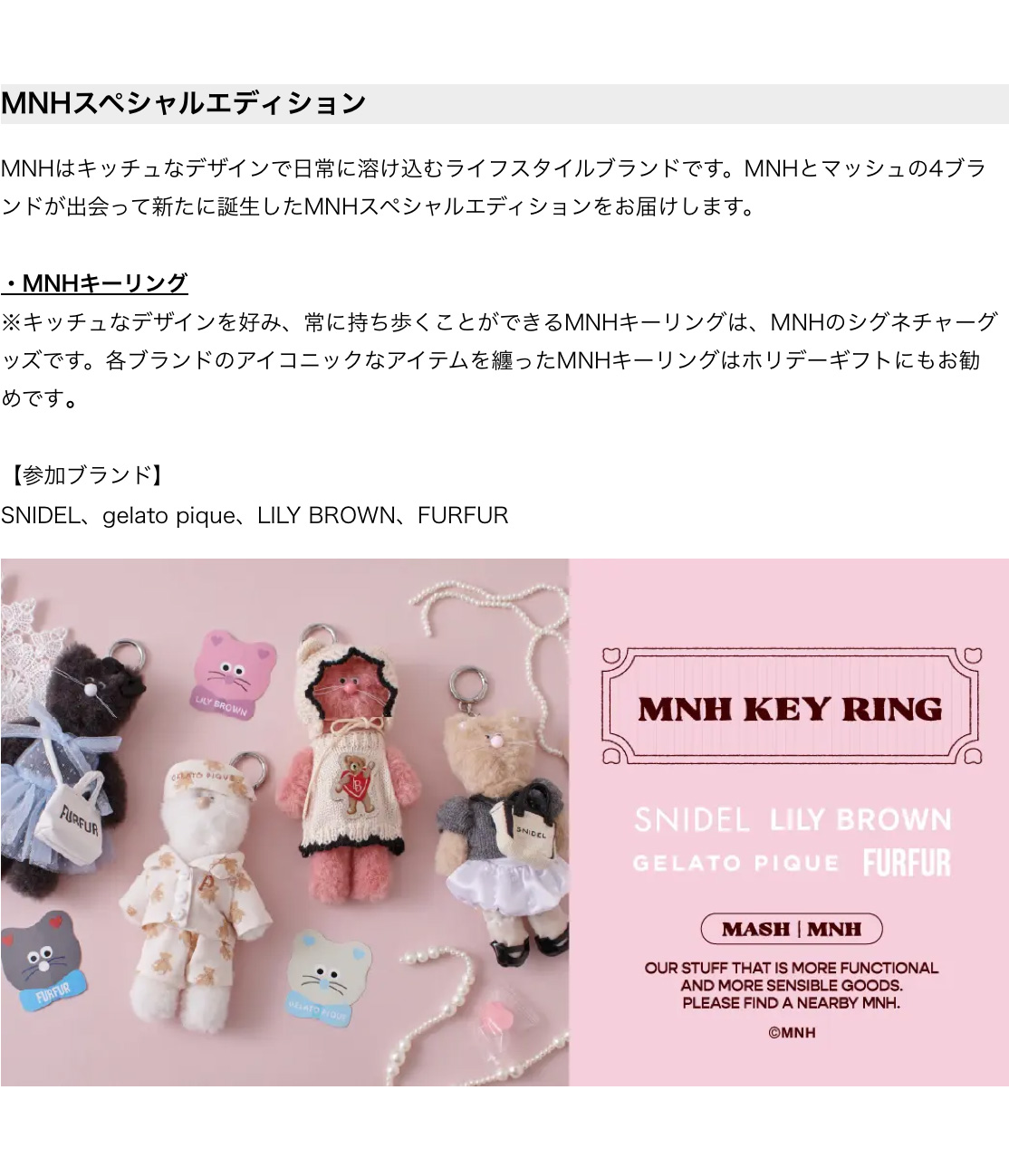 株式会社マッシュホールディングス MASH初のブラックフライデーイベント「MASH BLACK FRIDAY」を19サイト横断で開催!本田翼さんをミューズに、一年の感謝をお届け!〈11/27‐12/3〉 ホリデーシーズン限定アイテムや、ブラックフライデーならではのスペシャルプライス商品、韓国で人気のMNH(エムエヌエイチ)のキーリングが登場!10%OFF、クーポンプレゼントなどお得なキャンペーンも開催 (2025.11)