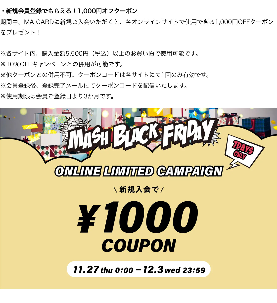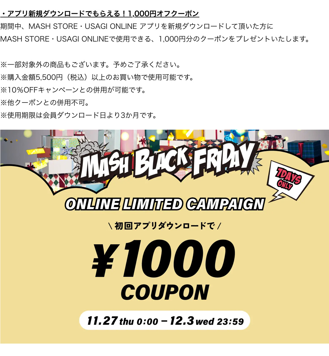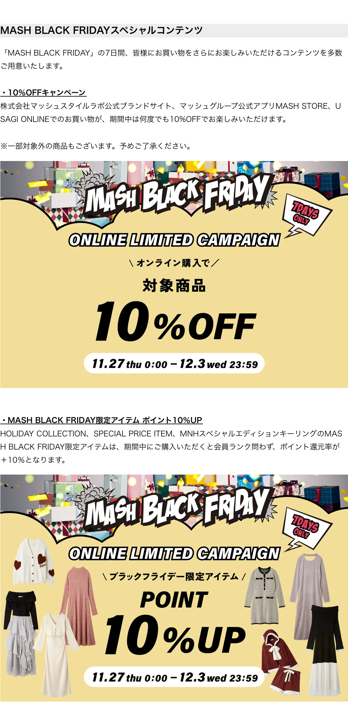 株式会社マッシュホールディングス(本社:東京都千代田区、代表取締役社長:近藤広幸)が展開するブランド公式サイト、マッシュグループ公式アプリ「MASH STORE(マッシュ ストア)」および株式会社ウサギオンライン(本社:東京都千代⽥区/代表取締役社⻑:須藤誠)が運営するオンラインデパートメントストア「USAGI ONLINE(ウサギオンライン)」は、11月27日(木)0:00 ~ 12月3日(水)23:59まで「MASH BLACK FRIDAY」を開催いたします。
