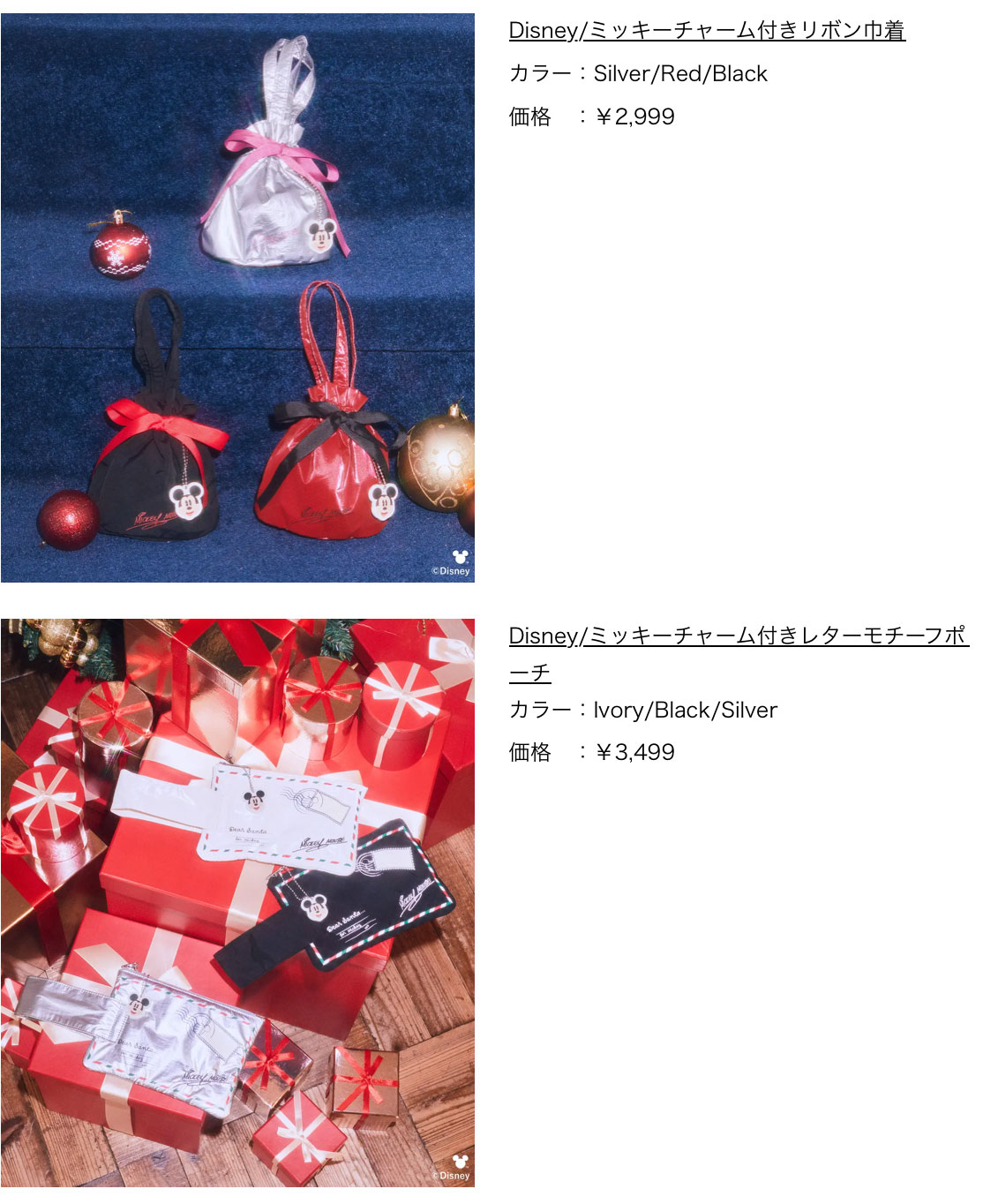 また雑貨では、日常に上品な可愛さを添えるアイテム全5型をご用意。「ミッキー&ミニー」のシルエットやリボン、ミラーを組み合わせた存在感のあるチャーム。クリスマスギフトのようなリボンがポイントの巾着型ポーチや、サンタクロースへの手紙をモチーフにしたポーチなど、この時期ならではの特別感が詰まったアイテムはプレゼントにもおすすめです。
