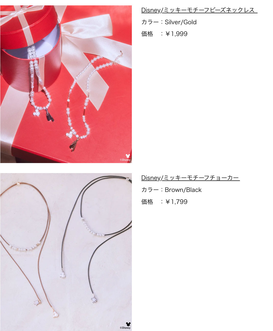 そのほか、さりげない「ミッキーマウス」とリボンモチーフが目を惹くビーズネックレスや、手袋モチーフ付きのチョーカーも取り揃えております。