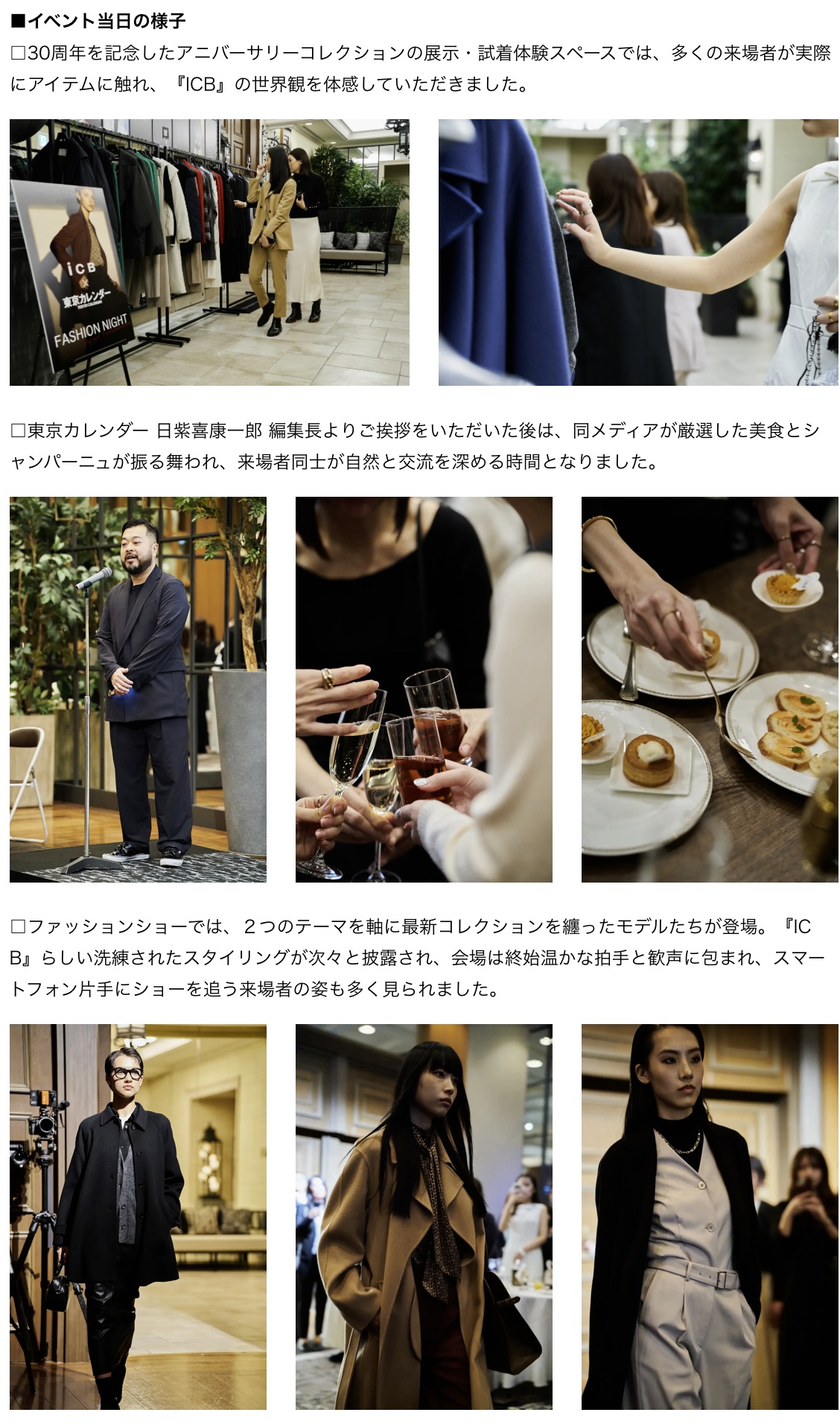 株式会社オンワード樫山(本社:東京都中央区 代表取締役社長:保元 道宣)が展開するブランド『ICB』は、都心で活躍するビジネスパーソンをターゲットとするライフスタイルメディア「東京カレンダー」と、次世代の女性たちにフォーカスした初のタッグを実現し、11月18日(火)に“現代を力強く生きる大人女性”に向けた特別なファッション&ネットワーキングイベント「ICB×東京カレンダー FASHION NIGHT with シャンパーニュ 2025」を開催しました。