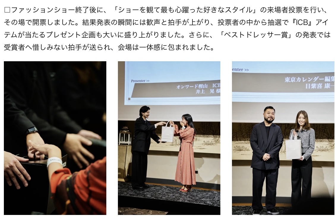 本イベントには、東京カレンダー読者を中心とした女性約90名が参加。当日は、東京カレンダーが厳選した美食とシャンパーニュとともに、『ICB』の最新コレクションをフィーチャーしたファッションショーを実施しました。終了後には、「ショーを観て最も心躍った好きなスタイル」の来場者投票を行い、その場で開票し、一番支持を集めたスタイルに投票した方の中から抽選で当ブランドのアイテムが当たるプレゼント企画や、来場者の中から輝いていた方を選出する「ベストドレッサー賞」など、参加型のコンテンツが会場を大いに盛り上げました。