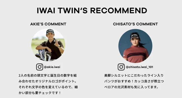 今回のコレクションは、岩井ツインズの「シンプルでカッコよく!」というこだわりを反映したモノトーンを基調としたラインナップ。ゴルフシーンはもちろん、デイリー使いにも対応するアイテム。
