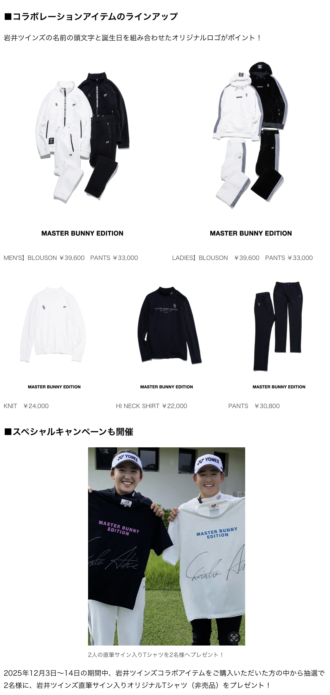 株式会社TSI(本社:東京都港区、代表取締役社⻑:下地 毅)が展開するゴルフアパレルブランド、「MASTER BUNNY EDITION(マスターバニーエディション)」は、今季アメリカツアーでも大活躍の岩井明愛・千怜プロとの初コラボレーションアイテムを全国MASTER BUNNY EDITION店舗とオフィシャルオンラインストアmix.tokyoにて2025年12月3日より発売いたします。