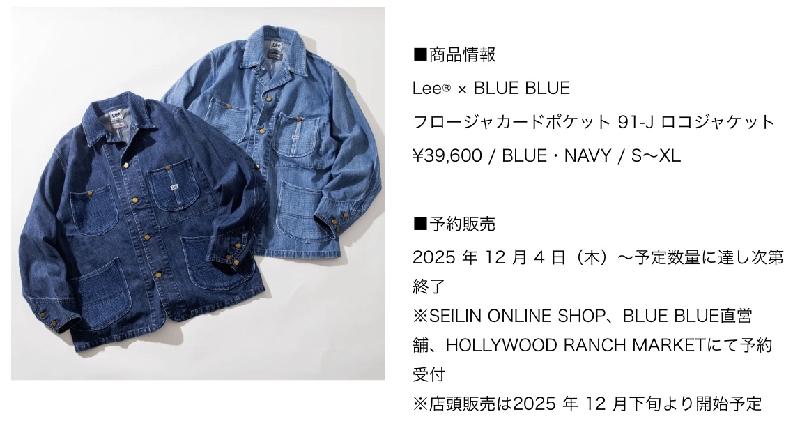 株式会社 聖林公司 【Lee × BLUE BLUE】両ブランドのオリジナルデニムを融合した別注第2弾。名作「91-J」をベースにしたカバーオールが登場!12月4日(木)より予約販売開始 アメリカの老舗ジーンズブランド〈Lee〉と、デニムとインディゴブルーにこだわりモノ作りを展開する〈BLUE BLUE〉による唯一無二の別注デニムカバーオールを発売します。 (2025.12)
