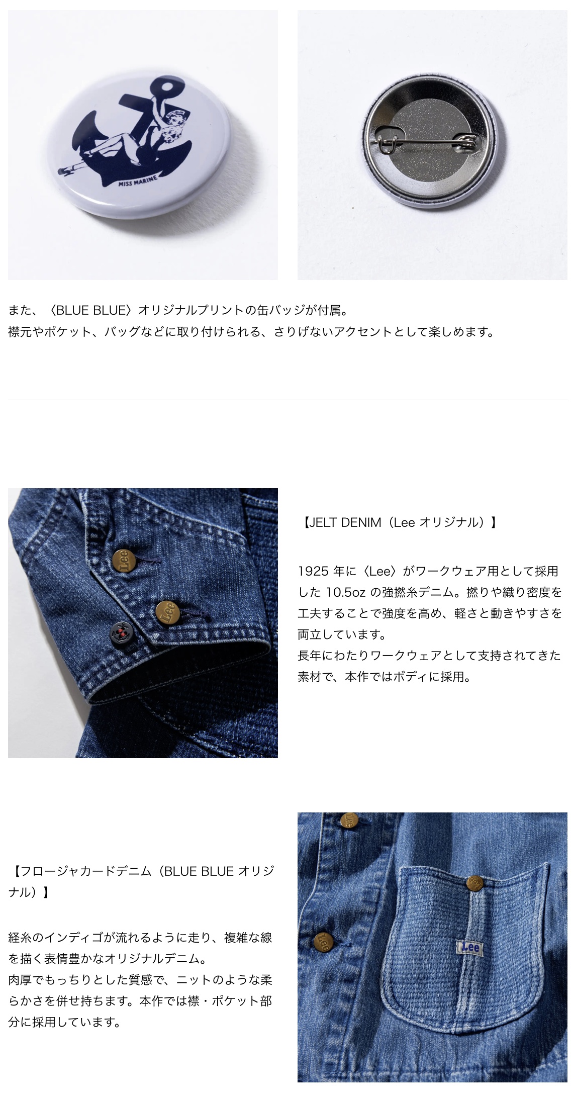 〈Lee〉が 1925 年にワークウェア用として採用した「JELT DENIM」は、2025 年に 100 周年を迎えます。節目の年となる本年、クラシックな「JELT DENIM」と、〈BLUE BLUE〉オリジナルの「フロージャカードデニム」を組み合わせ、素材のコントラストが際立つ存在感のあるカバーオールに仕立てました。