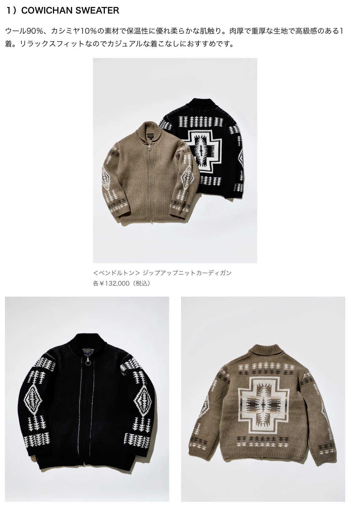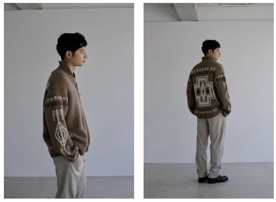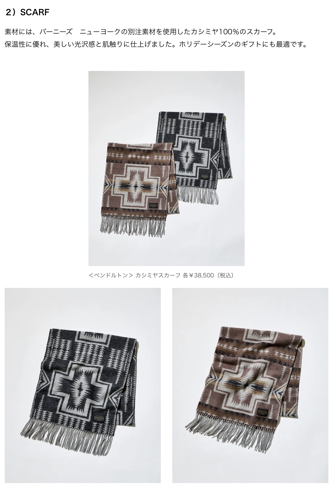 それぞれにネイティブアメリカンの伝統的なモチーフであるハーディング柄を落とし込んだデザインが特長で、バーニーズ ニューヨーク別注の素材を採用し、レザー仕様のロゴネームを施したラグジュアリーなアイテムです。肉厚なジップアップカーディガンは、化繊ではなくカシミヤをブレンドすることで柔らかい風合いに。スカーフはカシミヤ100%の肌馴染みの良い質感で、<ペンドルトン>からも恐らく初めての素材別注だというほど、バーニーズ ニューヨークテイスト溢れるアイテムです。