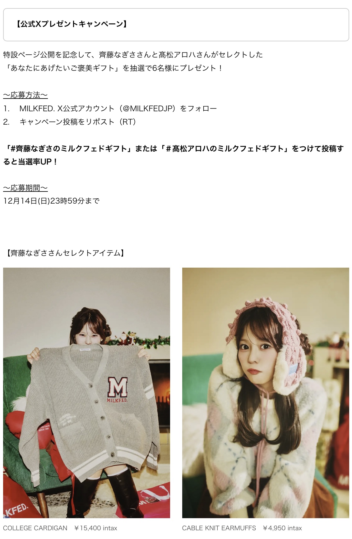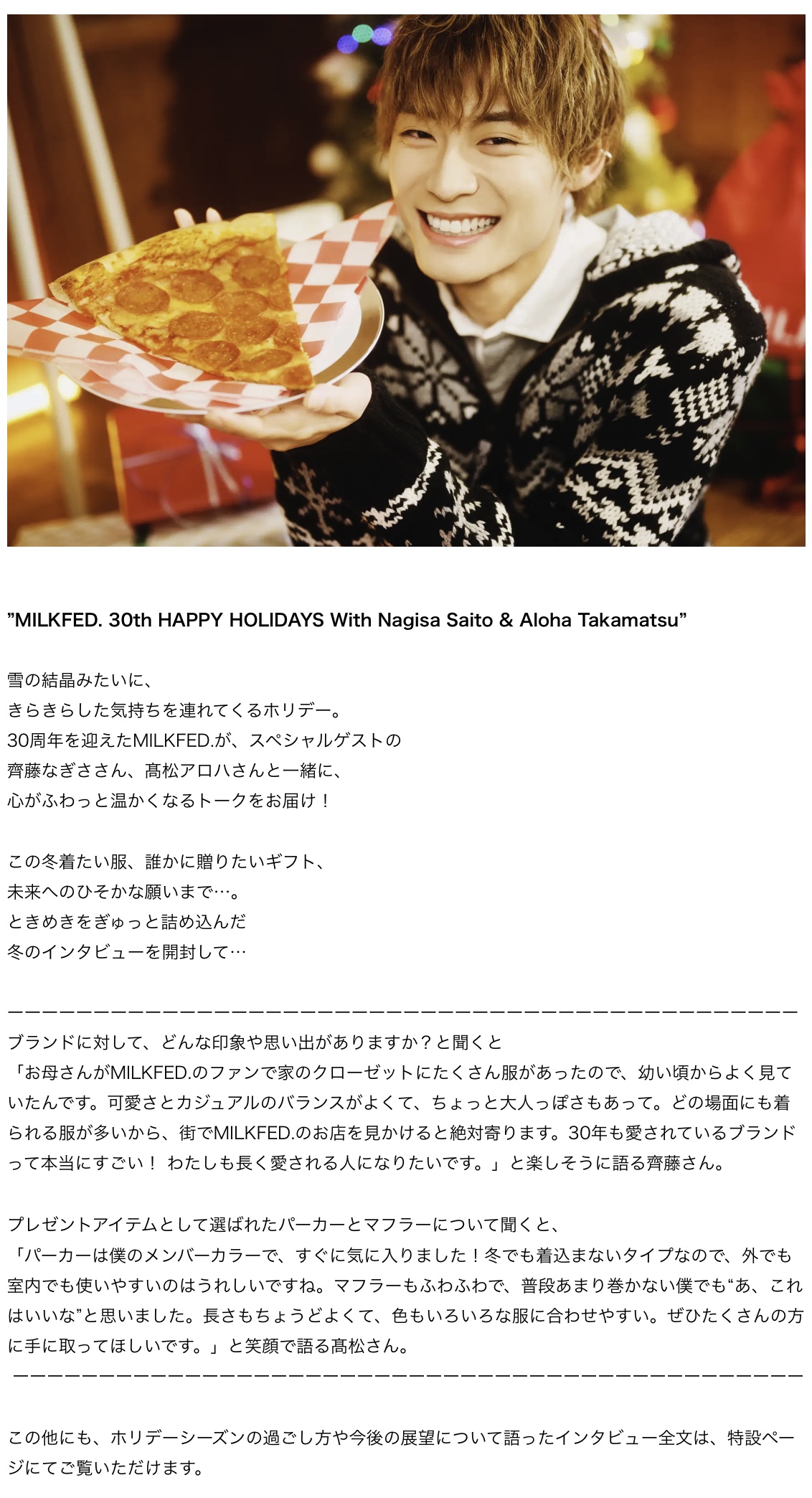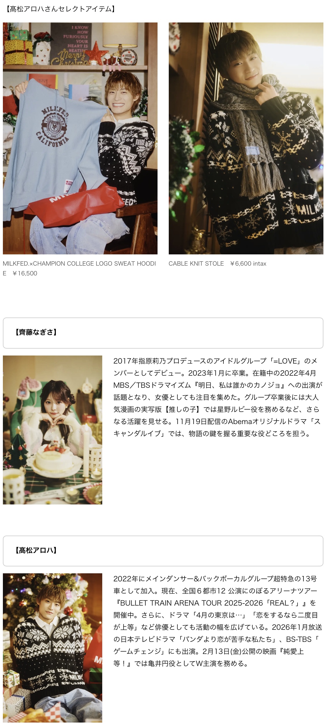 株式会社ビーズインターナショナル 【MILKFED.(ミルクフェド)】女優・齊藤なぎさとアーティスト・髙松アロハ(超特急)が、30周年のホリデイシーズンをお祝い! 30周年を迎えるMILKFED.(ミルクフェド)のホリデーシーズン企画に、女優・齊藤なぎささんとアーティスト・超特急の髙松アロハさんがスペシャルゲストとして登場。 (2025.12)