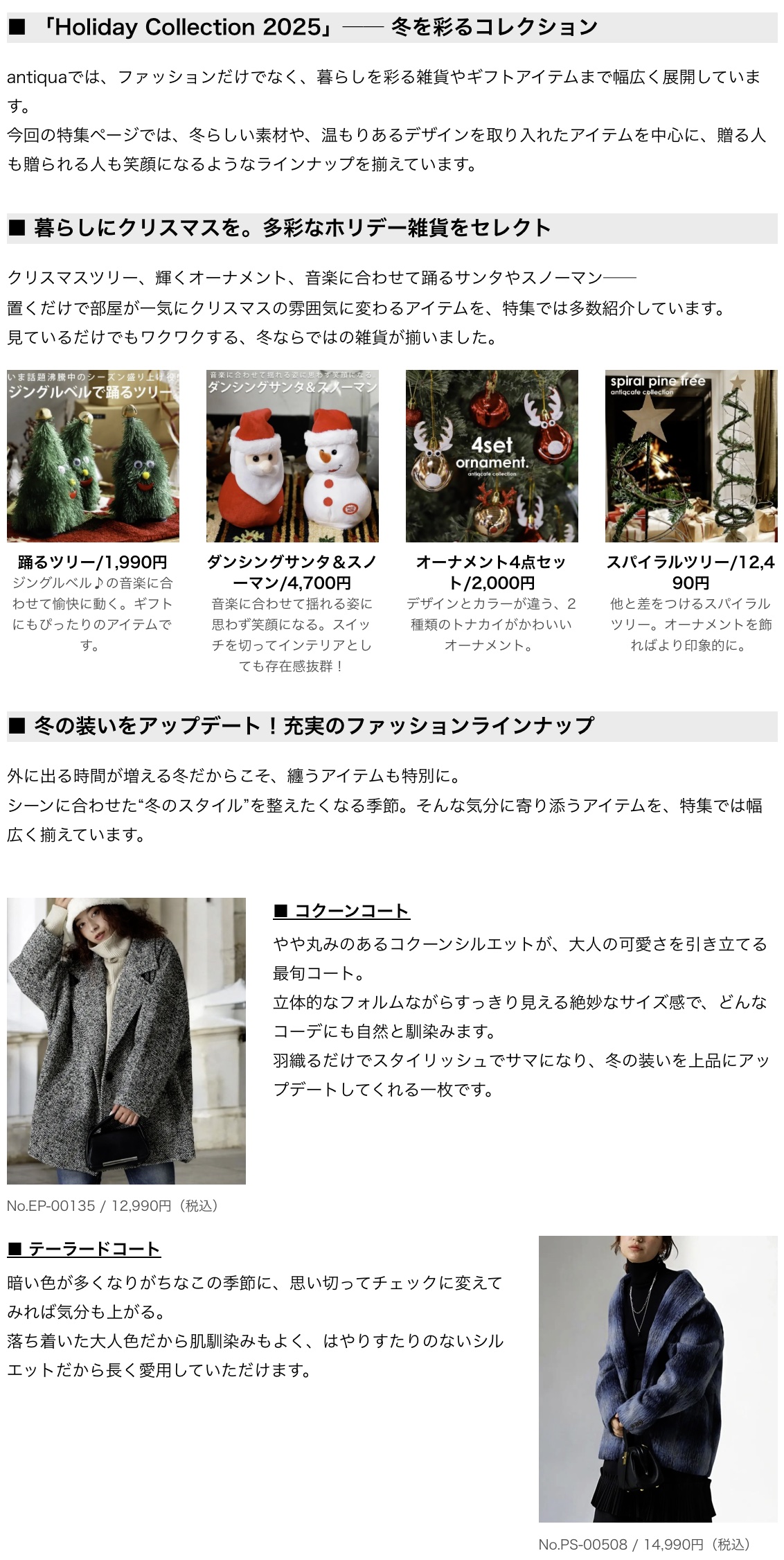 株式会社antiqua(本社:大阪府和泉市)は、冬の訪れをより自由に楽しむための特集ページ「Holiday Collection 2025」を公開しました。