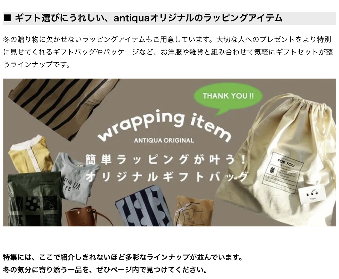 “誰かに贈る日” だけでなく、“自分のために楽しむ季節” としてクリスマスを過ごせるよう、antiquaならではの感性でセレクトしています。