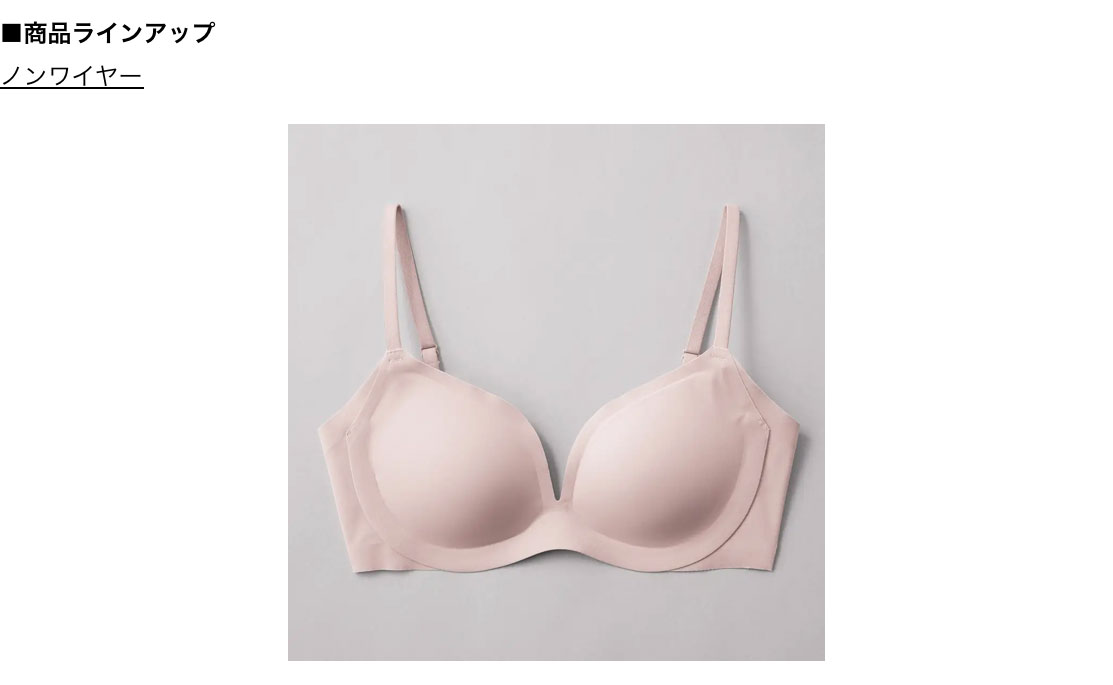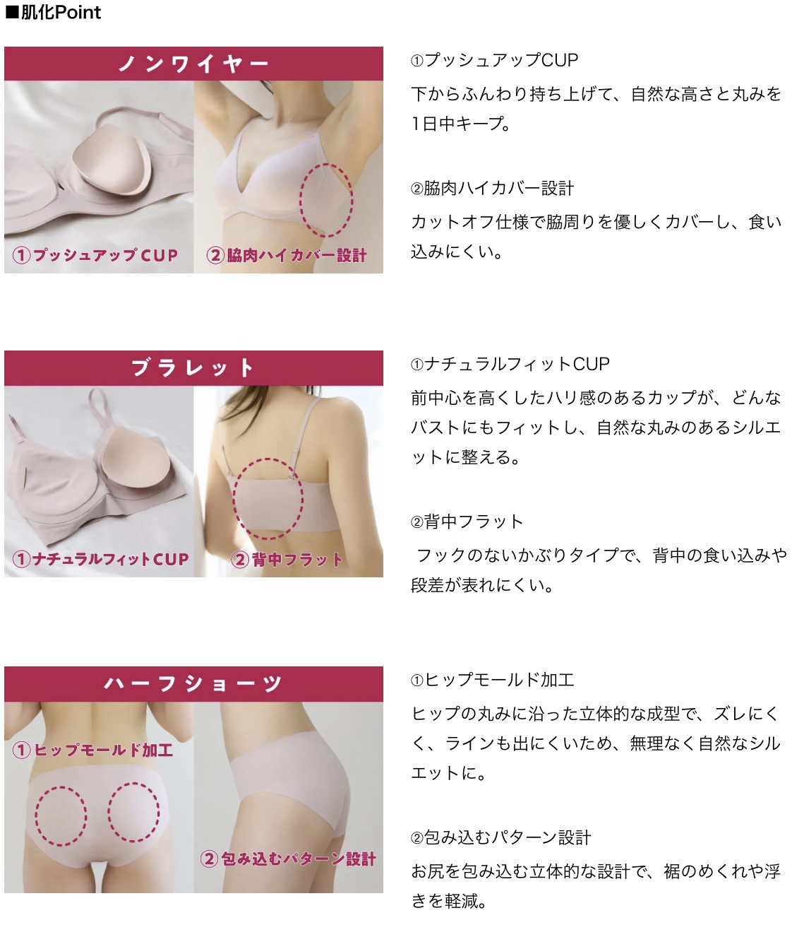 独自の「曲線立体接着」技術で縫い目をなくし、曲線をなめらかにつなぐことで、肌との摩擦を抑え、人の体に沿う繊細なつくりを実現。まるで、“肌の一部”のように馴染む着け心地で、ノンワイヤーでもバストの下の丸みにぴったり沿い、カップ上部もパカパカしにくく、1日中美しいバストシルエットをキープします。パーツ同士の段差も少なく、アウターにひびきにくい仕上がりです。