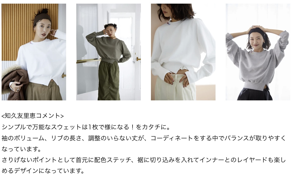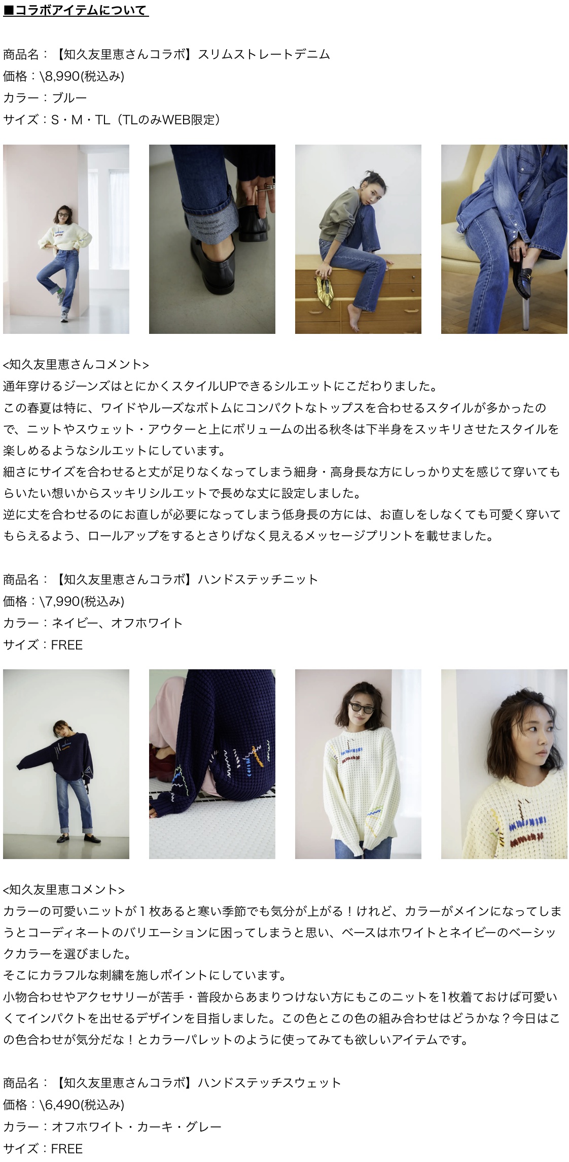 知久友里恵さんとのコラボアイテムは、スタイルアップが叶うシルエットにこだわったデニムと、刺繍のカラーをカラーパレットのように使うことでスタイリングがキマるニット、袖丈や裾のリブなどバランスがとりやすく1枚でもサマになるスウェットの全3型をご用意しました。