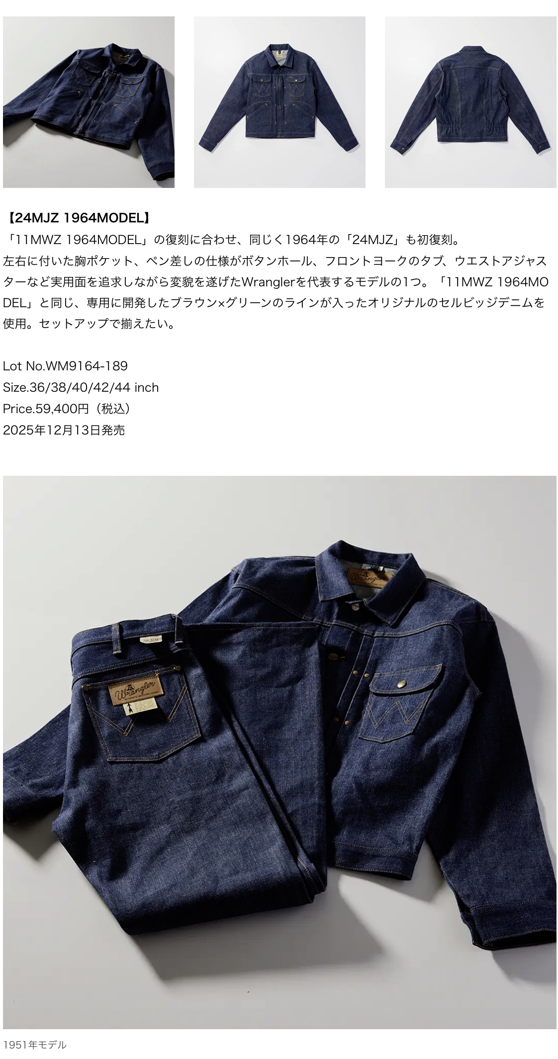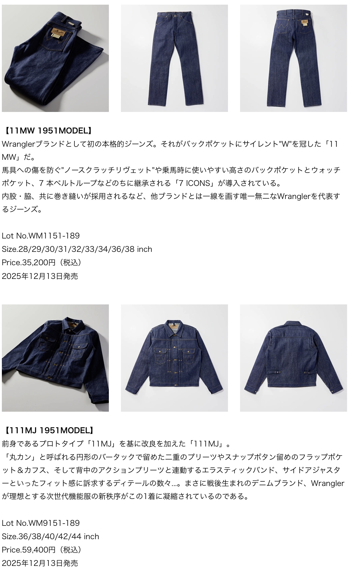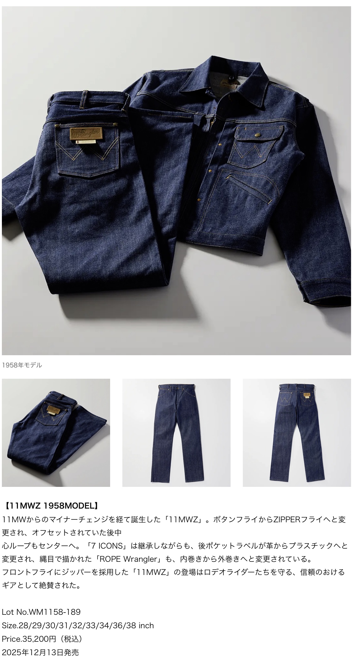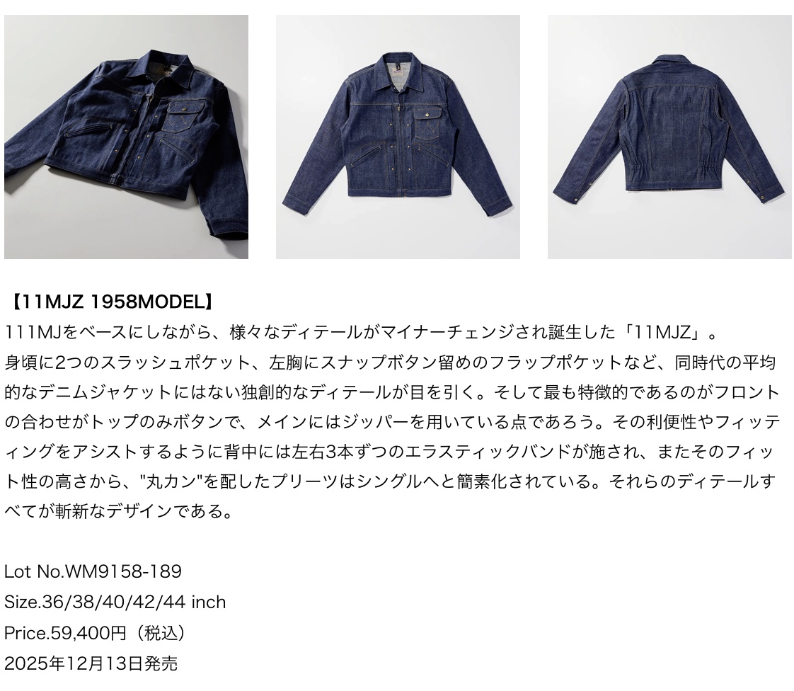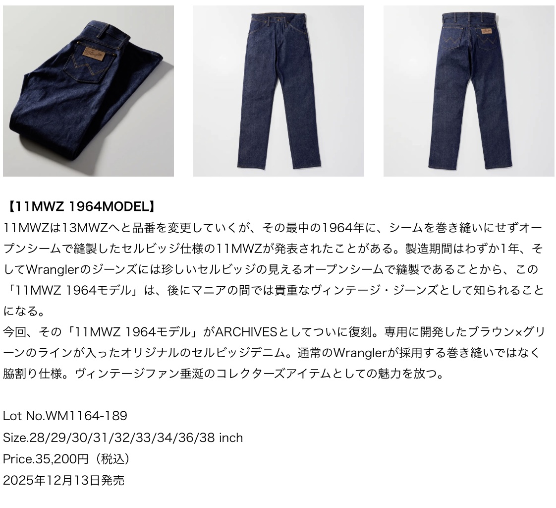 EDWIN ジーンズブランド「Wrangler」、幻のジーンズと呼ばれる1964年モデルがついに復刻。 製造期間はわずか1年。幻と呼ばれる11MWZと24MJZの1964年モデルが復刻。さらに、Wrangler ARCHIVESの中でも人気の1951年モデル、1958年モデルが日本製となり再復刻。 (2025.12)