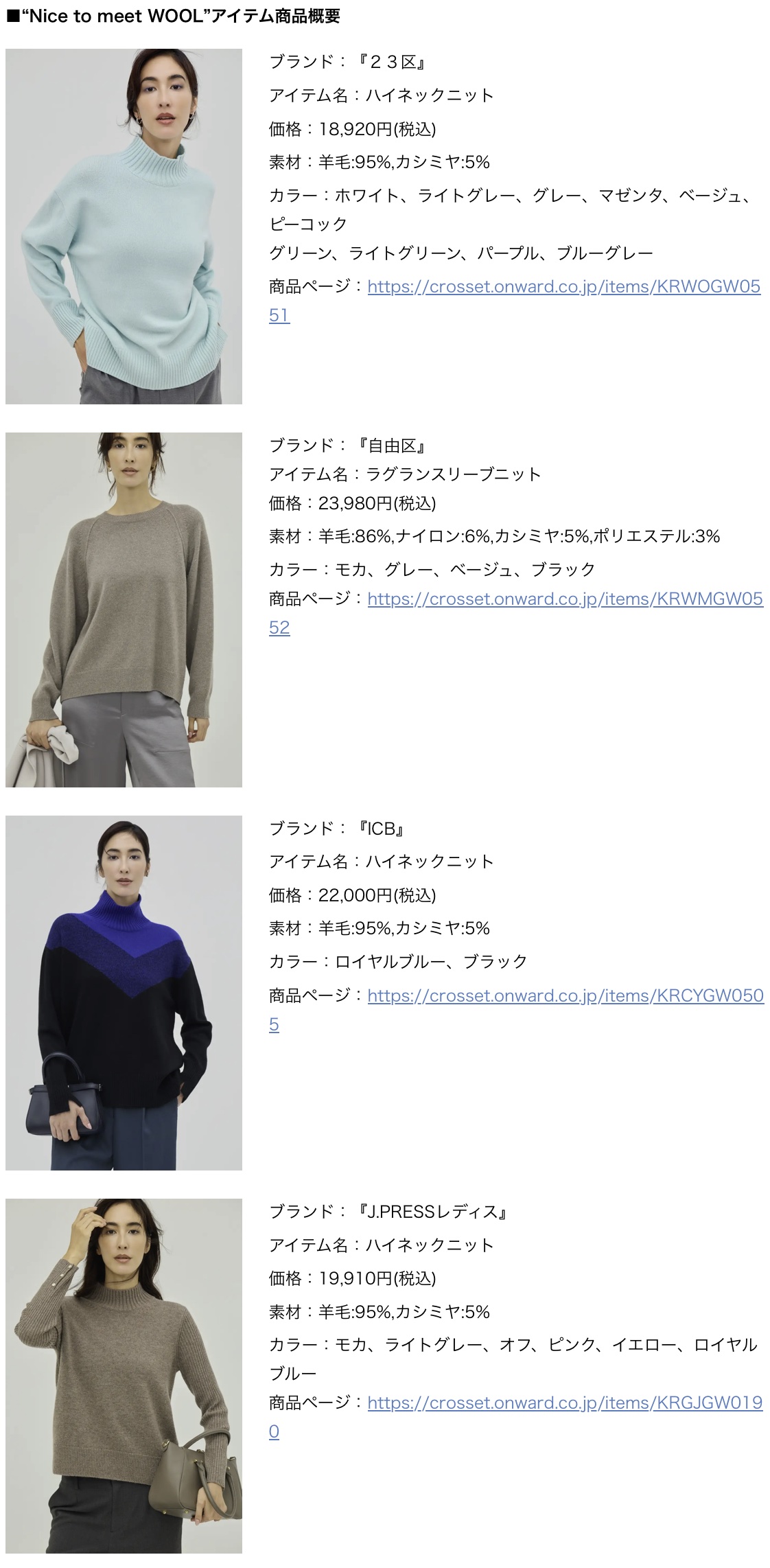 株式会社オンワード樫山(本社:東京都中央区 代表取締役社長:保元 道宣)は、WOOLからはじまる冬のおしゃれ“Nice to meet WOOL”を展開中です。『23区』『自由区』『ICB』『J.PRESSレディス』『BEIGE,』の5ブランドがザ・ウールマーク・カンパニー社との協業により、上質で肌触りの良いメリノウールアイテムをラインアップし提案しています。グループ公式ファッション通販サイト「オンワード・クローゼット」ならびに各ブランドのショップで好評販売中です。