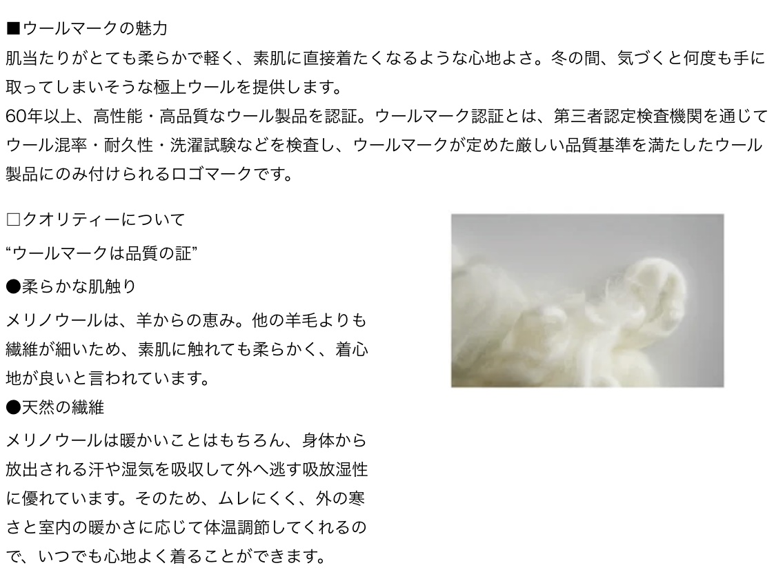 天然繊維であるウールは、暖かいことはもちろん、ただの冬素材で終わらない優秀なマテリアルです。販売中のアイテムには、上質で肌触りの良いメリノウールを採用しています。